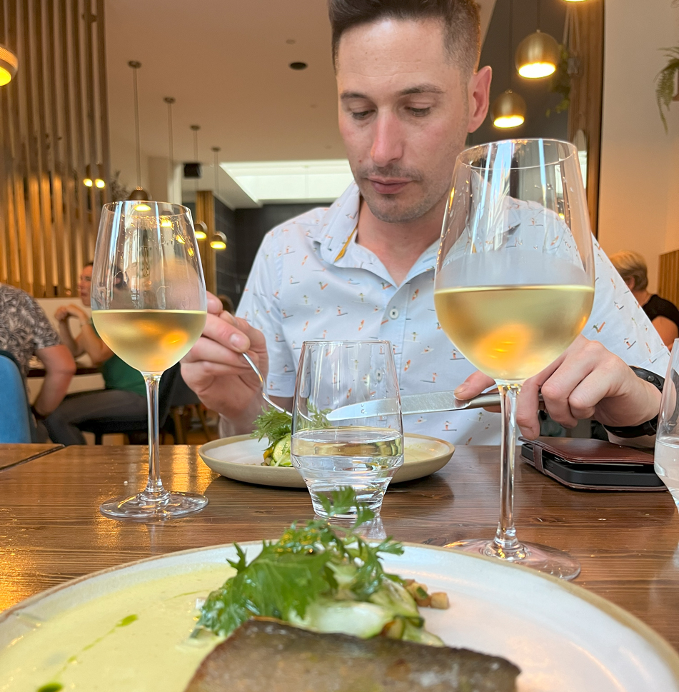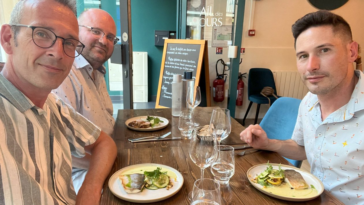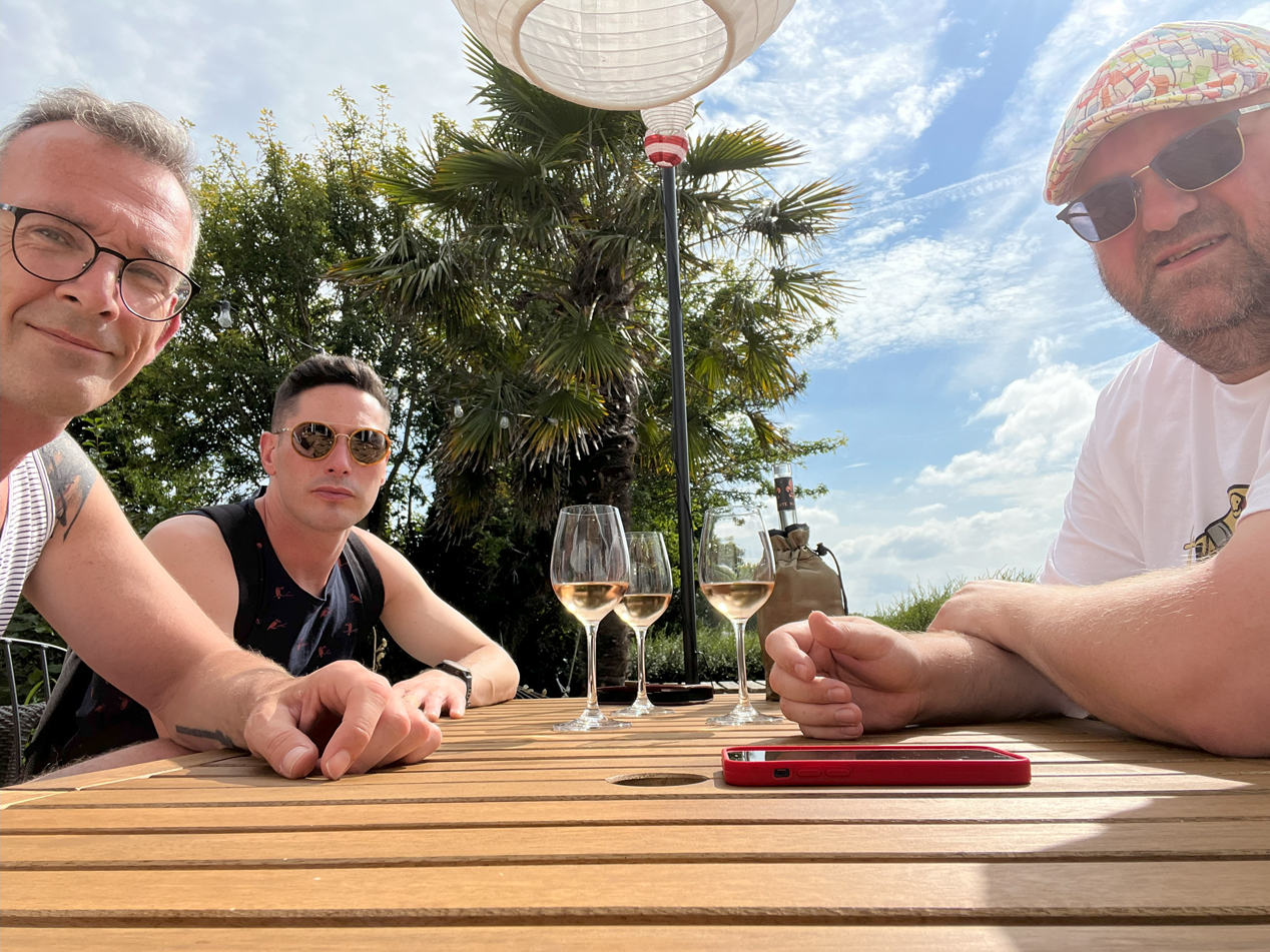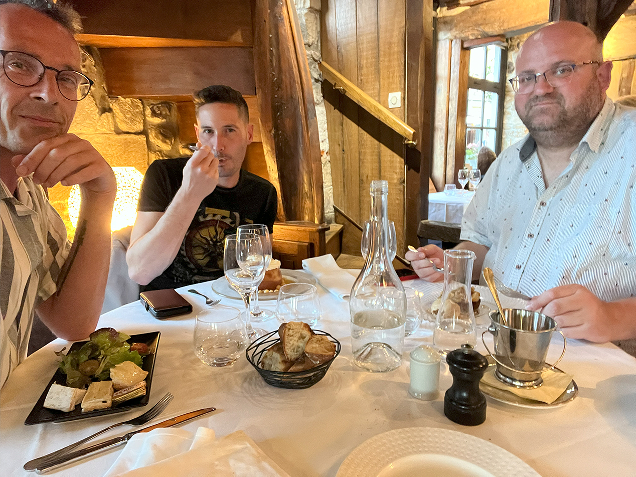 De eerste dikke druppels plenzen op het stoffige asfalt wanneer we de fietsen naast de Autoroller vastleggen onder een boom. Maar het begin van twee weken levensgenieten met z’n drieën kan na deze avond al niet meer stuk. Instant geluk. Zelfs het onweer dat dreigend overtrekt verstoort de stemming niet. Nog maar net in bed vraagt het reservatiesysteem mij al om een recensie na ons restaurantbezoek: “Accueil très chaleureux et une superbe ‘escapade’ entre amis de coeur. Bonne cuisine, service excellent avec des très bon vins. Top!”