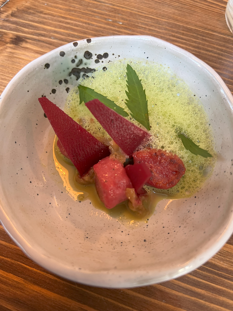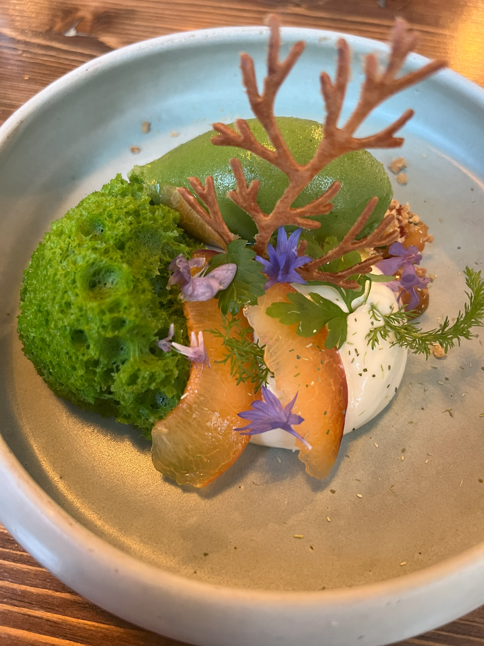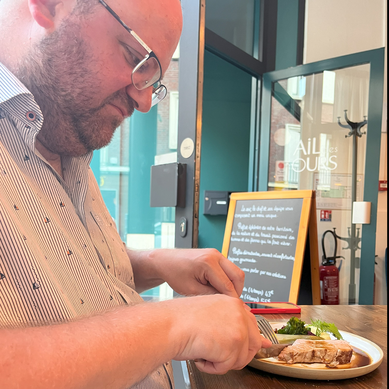 De chef en zijn commis schilderen een kleurrijk diner met overheerlijke combinaties, telkens begeleid door een bijpassende wijn. En voor ons normale doen ook verrassend veel flessen water. De avond valt en het donker komt, maar het blijft drukkend warm. Aan het open raam komt nauwelijks koelte binnen. De eerstvolgende passage samen in Amiens, komen we zeker en vast naar Ail des Ours terug, want ook Wouter en Cris zijn enthousiast. De naam van de zaak kon het al verraden, sinds we hem coöpteerden in ons huwelijksverbond heb ik iets met troetel- en andere beren. Grand Ours et Petit Nounours, het zou de titel van een mooi sprookje kunnen zijn. Daslook, hetzelfde onkruid in het Vlaams, associeer ik dan weer niet met mijn schaamteloze romantiek.