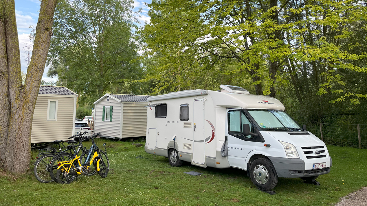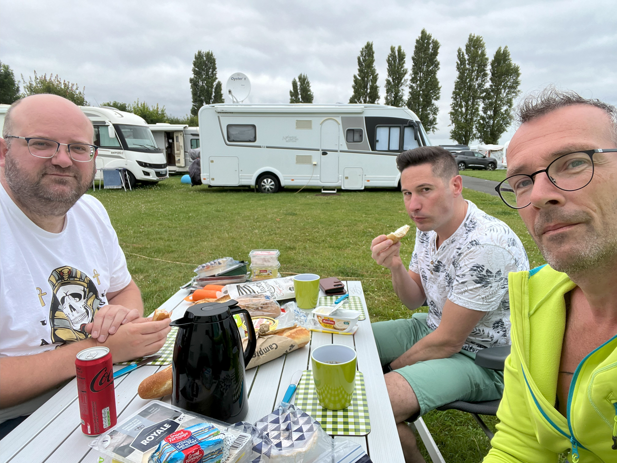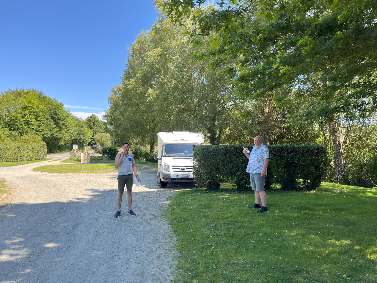 Ergens kort over de middag komen we aan in Péronne waar de receptie blijkbaar gesloten blijft tot 16u dat stond zo niet in Cris zijn bevestigingsmail. Ergens of een briefje aan het raam staat vermeld dat je een plaats kan uitkiezen en nadien komen inschrijven. Maar wat als je al reserveerde? Links en rechts staan bordjes op de vrije percelen met een naam, familie zus, mijnheer zo. Dus beginnen we met z’n drieën de ganse camping af te lopen op zoek naar een plaatje ‘Tits’. Niet te vinden, tot we terug bij het kantoortje staan en merken dat er een lijst met plaatsnummers en reservaties op een bord buiten staat. “Ah godverdomme!” En géén van ons drieën die het had gezien. Cris loopt vooruit, voor bij het servicepunt en het sanitair vinden we onze voorbehouden plek.