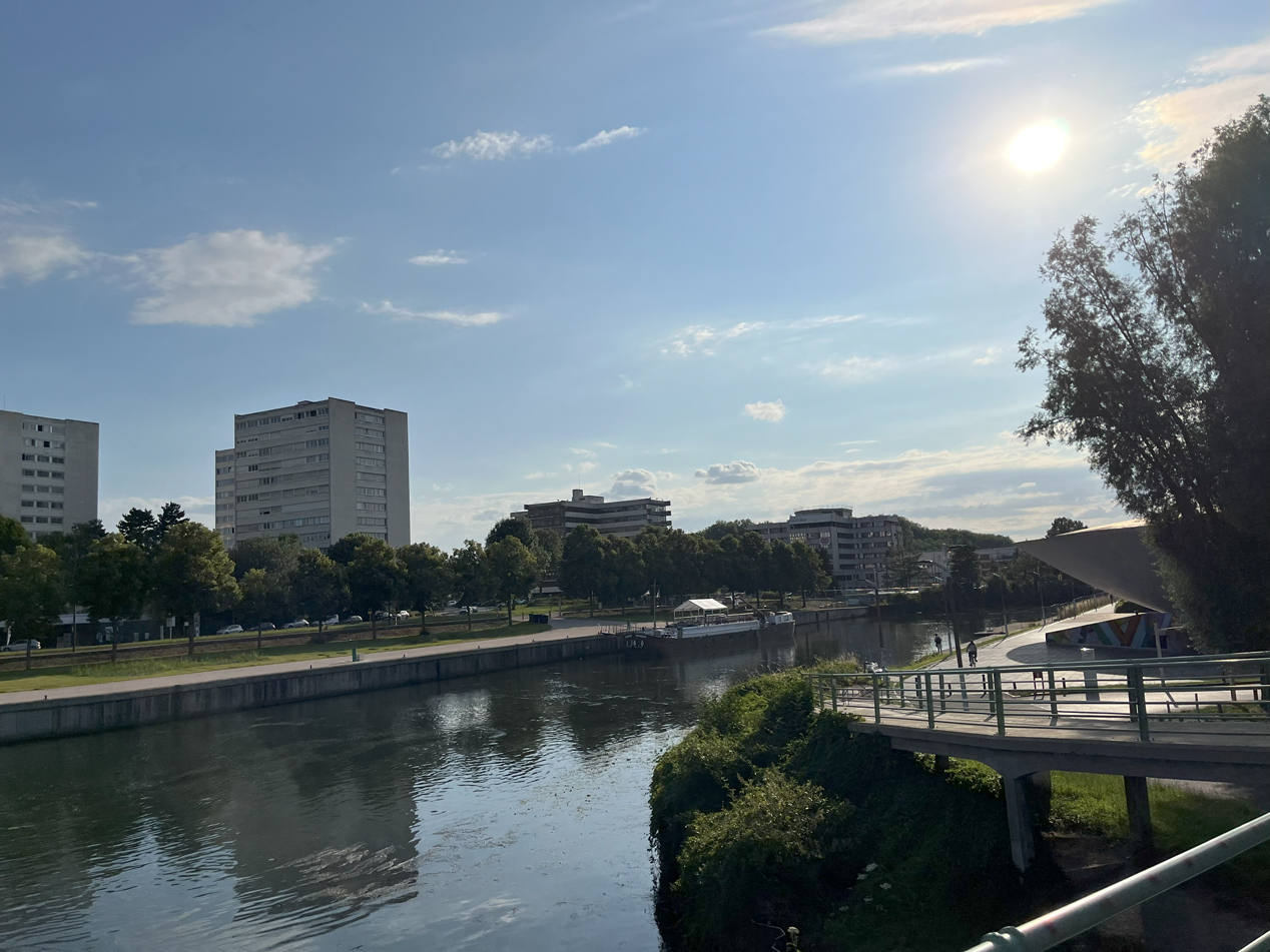 Gelukkig zijn we er nog mooi op tijd en de camping is door de hoge hagen en bomen omzoomd. Zoals de routine het wil, stapt Cris uit om in te checken terwijl Wouter en ik wachten voor de slagboom. Koel gaat het hier vandaag waarschijnlijk niet meer worden. De hoge bewolking die op komt zetten, maakt de zware lucht nog drukkender. Ik verwacht alle momenten weer een hitteonweer zoals die avond in Amiens. “Gaan we sebiet eens kijken naar de guingette achter het kampeerterrein bij het water? Naar het schijnt kunt ge daar ook iets eten.” Niemand heeft zin om te grillen bij deze tropische temperaturen, maar het terras en alle bankjes in park zitten overvol.