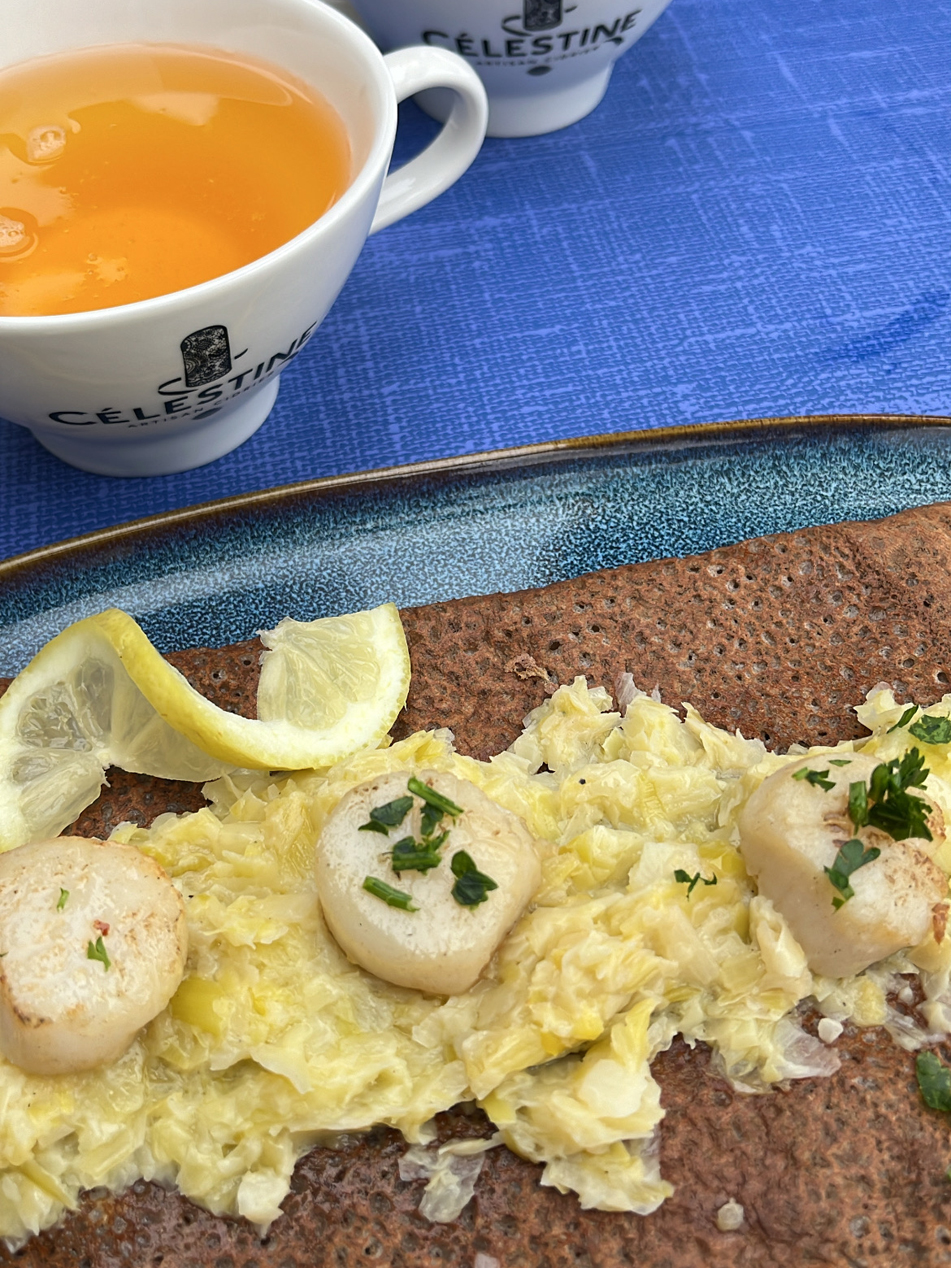 Confiserie Saint Antoine herken ik wel want tussen de produits régioneaux pronkt zelfs de cider van Le Manoir du Kinkiz nog van indertijd. Rond een uur of half één voelen we een druppel op onze kop dus reppen we ons naar het overdekt terras van La Voile Bleue. “C’est pour déjeuner?”, lispelt een gay garçonnetje. “Peut-être, oui, avez vous une carte?”, respondeert mijn even vrolijke vent. “Nu al eten”, schrikt de teddy na het stevige ontbijt!? Zijn buikje is daarvoor nog véél te blij. Cris zijn beer grolt wel al en kan gerust een crêpe salée op met een bolée Célestine erbij. Een hartige pannenkoek gaat er bij mij ook wel in want deze morgen heb ik net maar koffie gehad. Om bij de cider toch iets voor zijn neus te hebben staan, bestelt Wouter een half dozijn oesters. Ik heb bij het zien ervan al spijt van die gallette.