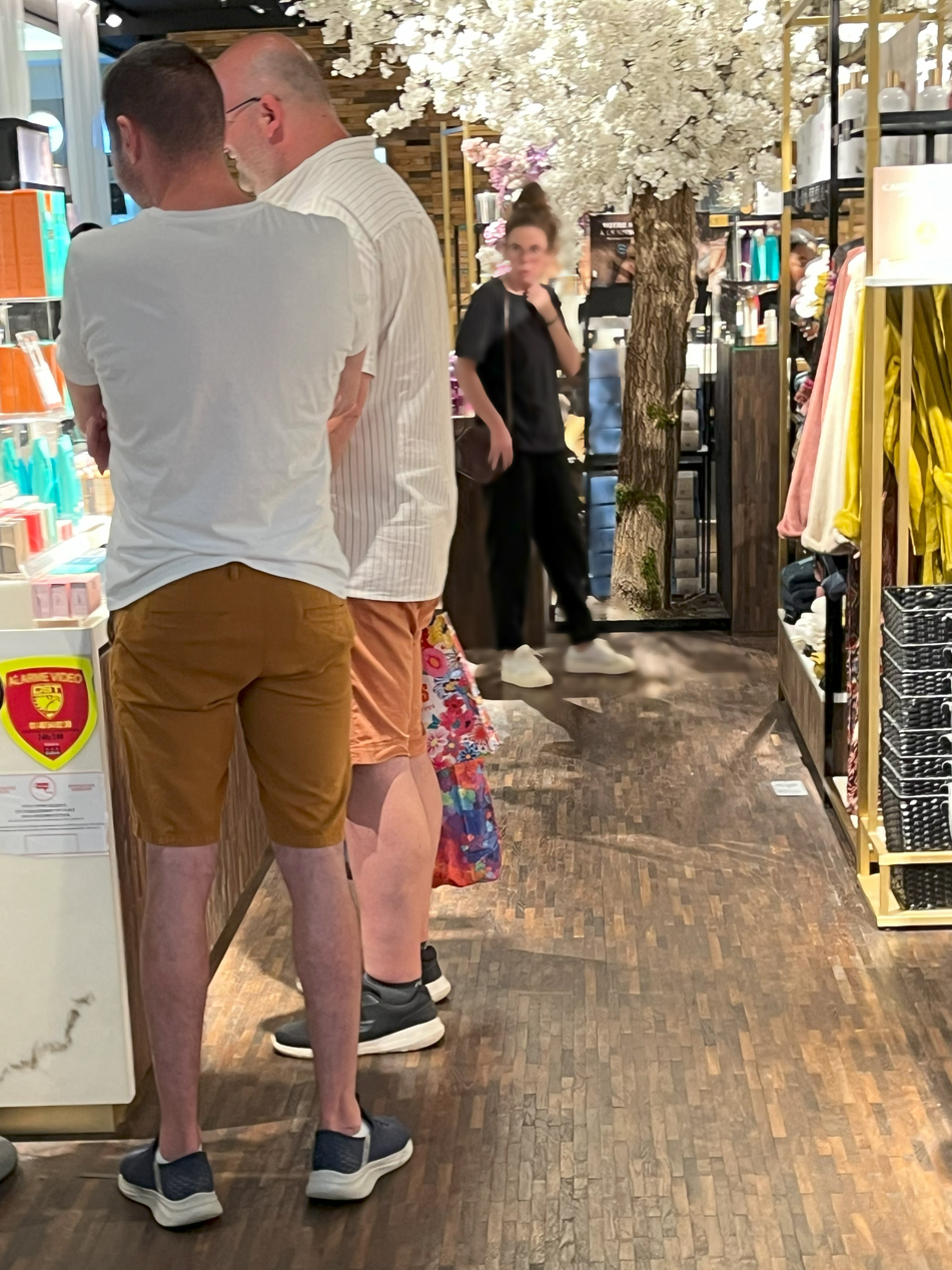 “Best dat hij iets eet voor hij weer hangry wordt”, jammert Cris tegen zijn opponent in het tijdelijke driemanschap. Een gezond slaatje en een yaourt aux fruits rouges, terwijl de samenspanners een broodje nemen met een moelleux au chocolat. Gewoon omdat de jongen achter de toonbank, precies ook eentje ‘van de familie’, voorstelt een menu te nemen. Beterkoop dan een broodje en een drankje apart, als je ook nog wat zoets wil achteraf. Daarmee kunnen we er weer tegen want we moeten elke etalage van de mega-shopping hebben gezien. Wouter belooft plechtig géén bermuda’s meer te kopen wanneer we de eerste zaak met merkkleding binnenlopen. Schoenen heeft hij deze vakantie nog niet gekocht, maar hij twijfelt weer, dus moedigen we hem wat aan en krijgt hij ze toch weer van ons.