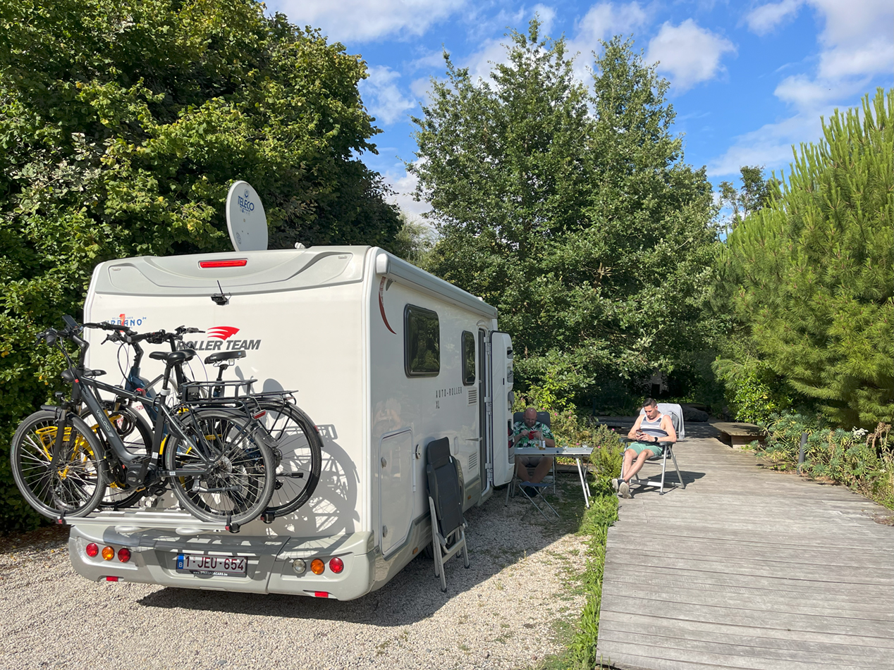 Geen détours meer onderweg, wel schuiven we aan in een file vanaf Plouharnel tot op de landengte die Quiberon en de Côte Sauvage met Morbihan verbindt. Een flink stuk in de namiddag is het er drukkend warm, wat een verschil met het weer de voorbije dagen. Ergens in het centrum waar de boulevards Anatole France en Bonne Fontaine elkaar dwarsen, mis ik een verhoogd kruispunt. Met geweld botst de Autoroller over die bult. Pas wanneer we op boulevard du Goviro voor de camping staan, merk ik op de achteruitrijcamera dat de fietsen wat meer achterover lijken te leunen.