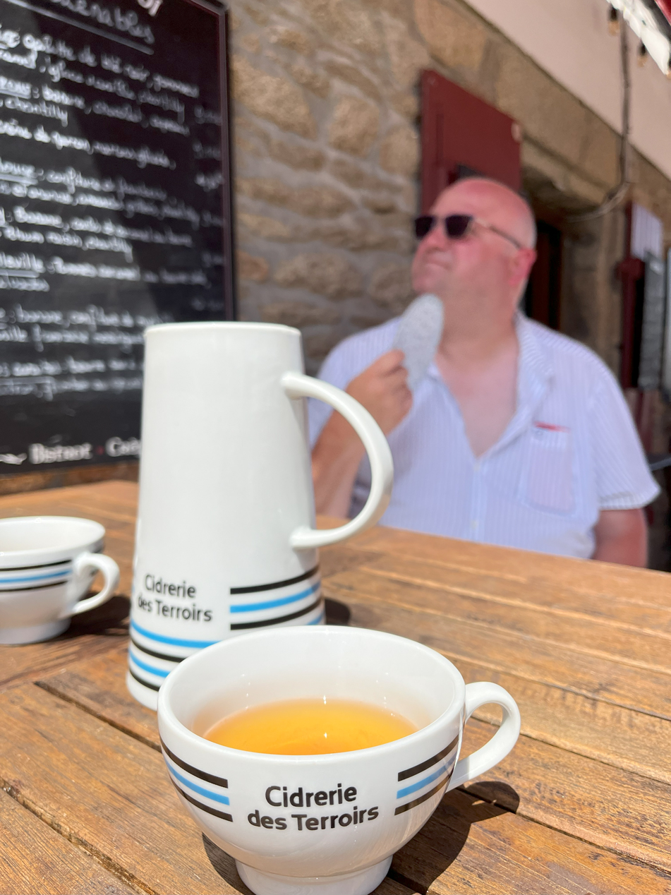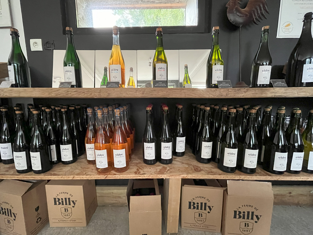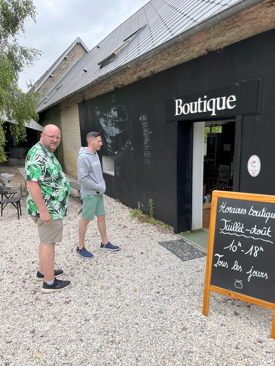 Wouter kwam ooit eens op studiereis naar Père Magloire in Pont l’Évêque en ook wij kennen het productieproces. Maar zo uitgebreid als vandaag werden we zelden ontvangen, van boomgaard tot assemblage van het goud in de kostbare fles. Geen wonder dat ze iedereen laten betalen voor een visite. Uiteindelijk is er geen garantie dat iemand na de proeverij daadwerkelijk iets koopt. Nemo en de keldermeester laten ons één na één alle vergiste appelsappen en distillaten proeven. Daarbij gaat de praatgrage jongen uitvoerig met ons in gesprek, want hij weet dat we om de naam van de hond speciaal hier zijn en calvados van Billy komen kopen. Na de degustatie sleuren we twee dozen cider, één Brut en één Fraîcheur, mee en nog wat likeuren en distillaten voor thuis. Zelfs een gekoelde fles cider voor het aperitief!
