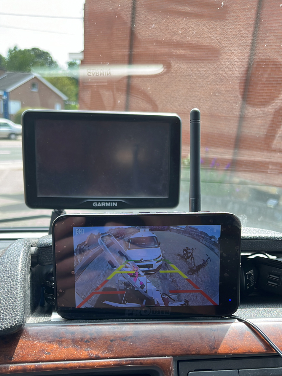 Het is een groothoekcamera met hulplijnen om de afstand in te schatten. “Amai, dat is wel veel scherper,” zegt Wouter, opgelucht dat niet alleen het beeld van de achteruitrijcamera, maar ook mijn humeur is opgeklaard. “Waar zetten we het nieuwe scherm?” Het oude display hangt wiebelend voor de achteruitkijkspiegel, die zo eigenlijk nergens toe diende. “Ik zou het met de bijgeleverde zuignap gewoon tegen de voorruit plakken.” “Goed idee, dan kunnen we onderweg in de spiegel zien of Cris al slaapt.” Wouter gniffelt, omdat hij zelf vaak indut als hij naast me in de auto zit. Zelfs een grapje kan eraf en die frietjes zijn helemaal OK.