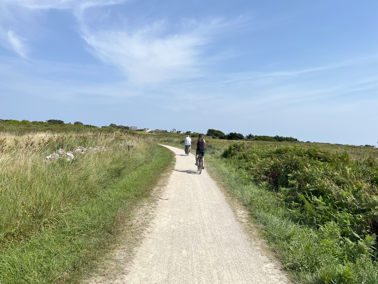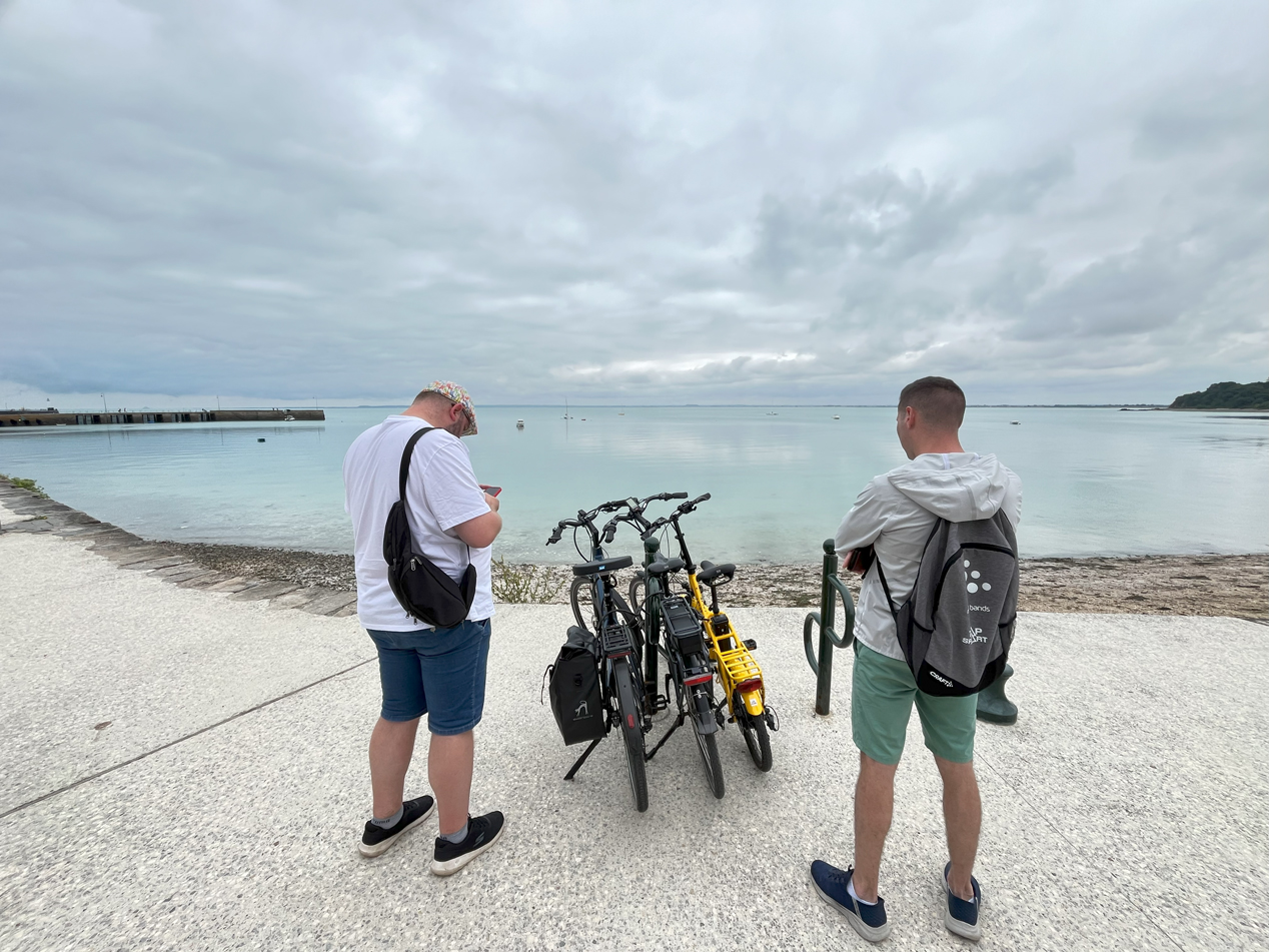 Gelaafd aan een karaf Bretoense cider volgen we opnieuw de bewegwijzering tot Saint-Julien. Dan gaat het in een brede lus helemaal rond Quiberon-ville naar de Côte Sauvage. Dat de Boucle ons over berg en dal zou loodsen, met onverharde wegen en nauwelijks befietsbare paden hadden we niet verwacht. Cris is beducht om in het mulle zand niet onderuit te gaan. Ik op de kleine wieltjes van mijn gele fiets die hulpeloos over keien en in alle putten botsen. Daardoor durf ik nauwelijks de ondersteuning van de e-bike op te zetten. Wouter en zelfs mijn huisband lopen alsmaar verder uit. Zonder valpartijen, maar wel met een grote dorst eindigen we het parcours bij de haven van het vakantieoord.