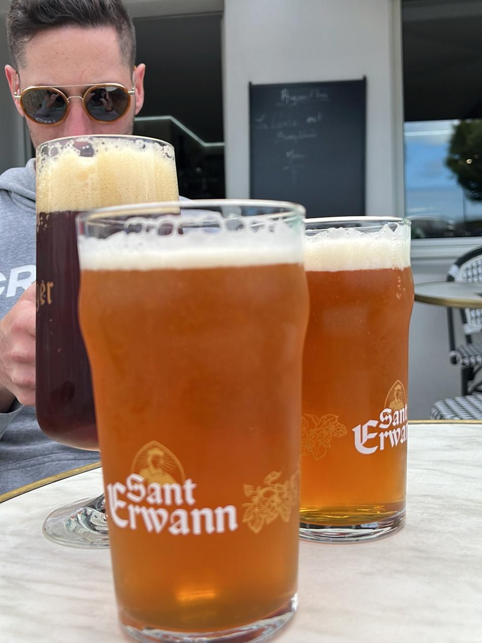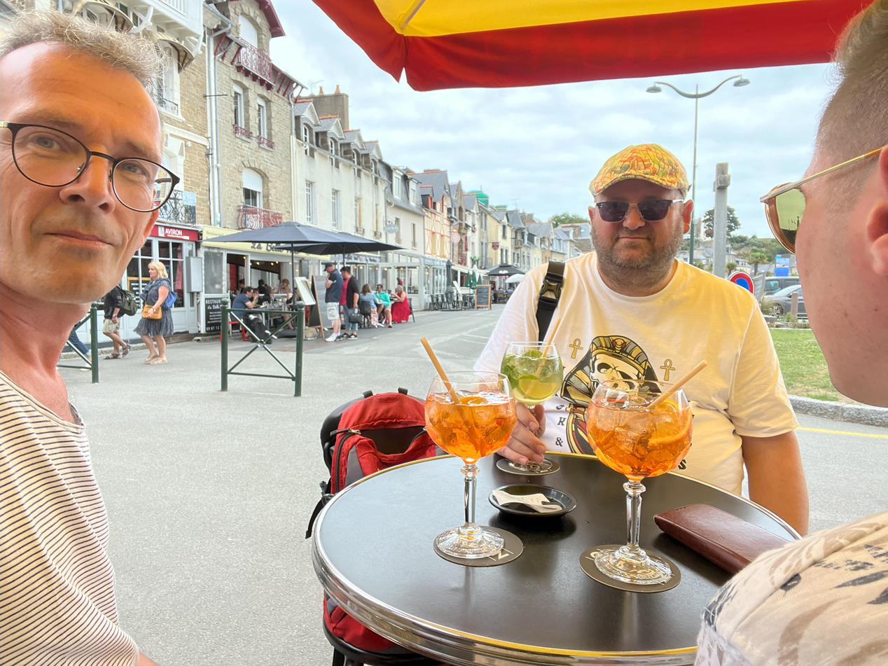 Eer we terug wandelen naar ons rijdende hotel, passeren we bij Le Panier Bénédictin, de plaatselijke kruidenier. Cœur de bœuf tomaten en een kropsla want die vonden we deze ochtend in de Cora niet. “Kijk daar”, stoot ik Wouter aan terwijl Cris al druk doende is met groenten uit te kiezen, “hier verkopen ze ook Studio.” Maar we moeten cider van Billy drinken! Of bier dat brouwen ze in Bretagne ook en tegenover de ingang van de camping is net een tafeltje vrij op het terras van Le Vendôme. Hoogtijd voor een fris getapte Sant Erwann of een Picon Bière zalig in de zon die langzaam door de wolken is gebroken. Heerlijk zomerweer, behalve flessen ‘josé’ afvullen en de volgende camping reserveren in Perros-Guirec luieren we de namiddag weg. Congé payé!