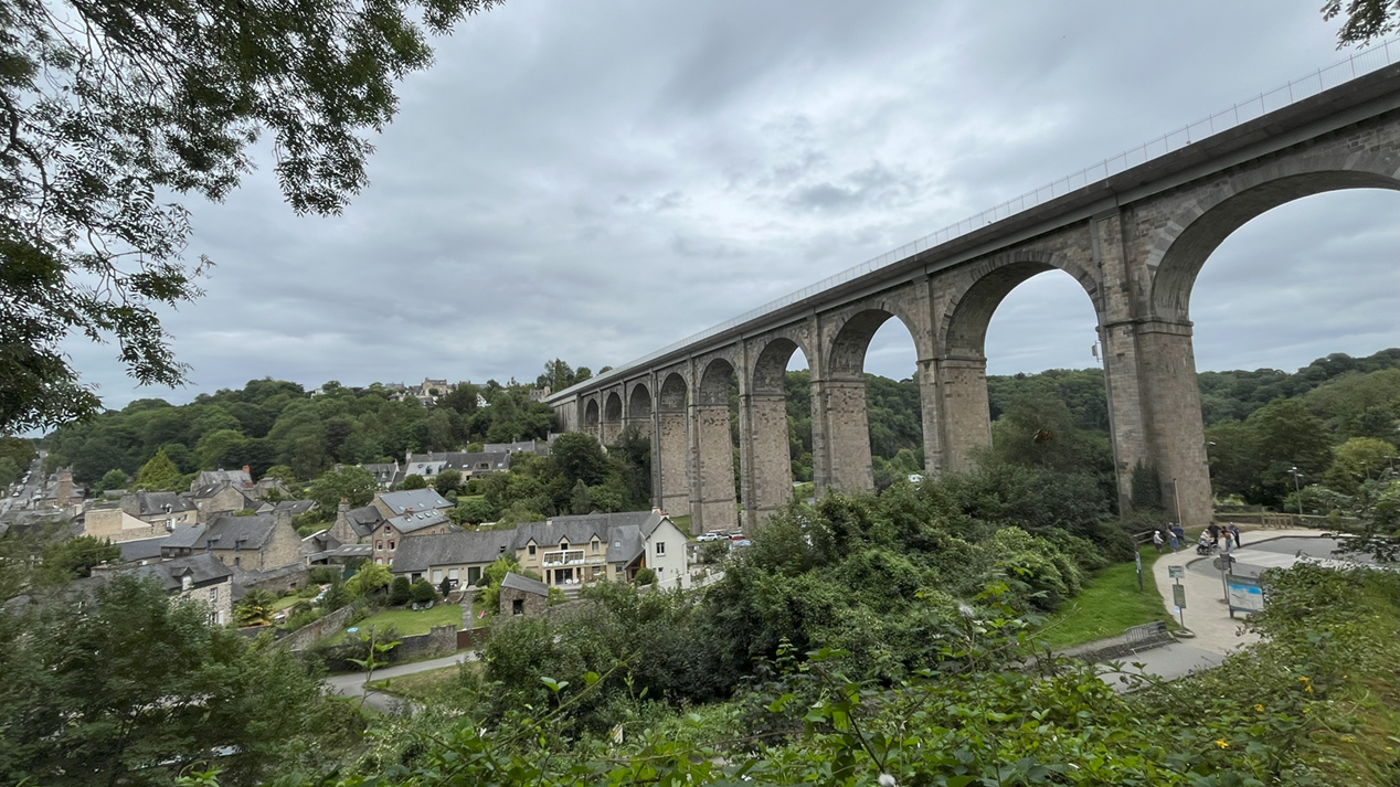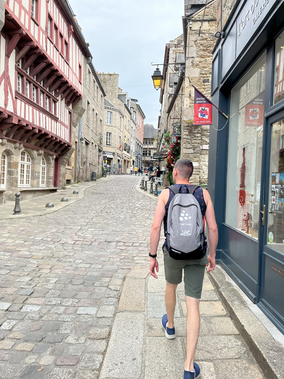 Na de ochtendkoffie en het optuigen van de fietsen, volgen de vaat, het inpakken en nog snel een warme douche. Het was best wel koud vannacht en de vooruitzichten zien er aan de noordkust van Bretagne nog altijd niet bijster zomers uit. Straks beproeven we ons geluk bij Domaine Trestraou om tot zondagochtend de Côte de granit rose of Aod ar Vein Ruz te verkennen in het Brezhoneg. Nu gaat de reis naar de parking in Dinan waar Place du Marché al een belletje had moeten doen rinkelen. Net vandaag staat er de wekelijkse markt en rond het centrum staan we vast in een monsterfile. Zelfs de officiële aire campingcar onderaan de vestingmuren bij La Rance staat vol personenwagens die elders geen parking hebben gevonden.
