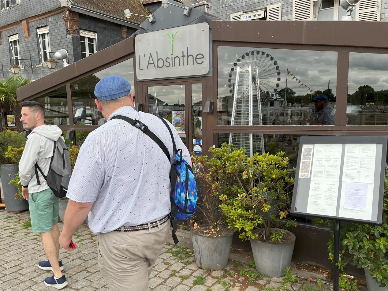Na nog meer etalages en winkels vol Calvados en boterbabbelaars hebben we het wel gezien, “tenzij iemand nog naar dat museum wil?” Dat hoeft niet zo nodig dus stappen we door en misschien ook wat in de wind terug naar de camperplaats waar we buren hebben gekregen. Uit een buscamper met Deense nummerplaten stapt een man vruchteloos speurend naar elektriciteit. Terwijl wij nog een fles ‘josé’ liquideren uit de extra frigo in de koffer, maak ik hem erop attent dat wij vanmiddag het laatste werkende stopcontact ingenomen hebben. Morgenvroeg kan hij zijn kabel insteken want wij vertrekken. Als drie bijkomende flessen onder het bed verdwijnen, moeten er drie weer uit. “Drink op jongens”, tijd om ons klaar te maken voor het surplus diner bij l’Absinthe.