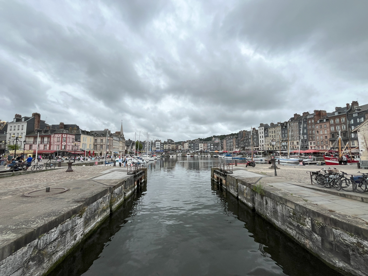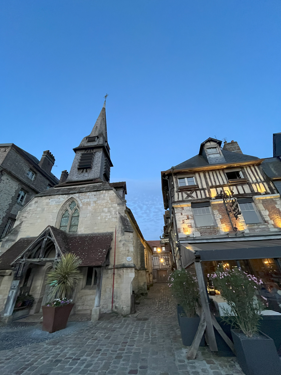 Kristof had gelijk de zeevruchten waren om duimen en vingers van af te likken. Alle buikjes blij, dat van de teddybeer zelfs iets te blij na dat enorme dessert. Dus maken we nog een ommetje langs de verlichte vakwerkhuizen tot aan het houten kerkje van Sainte-Cathérine. De nachtelijke kilte waait rond half elf met een zeebries over de Seine en heeft alle toeristen weggejaagd op de terrassen rond de Vieux Bassin. Aan de overkant langs Bassin de l’Est fonkelen de lichtjes van een reuzenrad dat een laatste rondje draait. Tijd voor het vaste avondritueel: logeerbed opmaken en naar dromenland. Morgen telefoneer ik naar Billy – de ciderboerderij niet zijn hond – om ons bezoek te verifiëren. Kunnen we er niet overnachten, dan rij ik gewoon door naar de camping in Saint-Benoît. On verra!