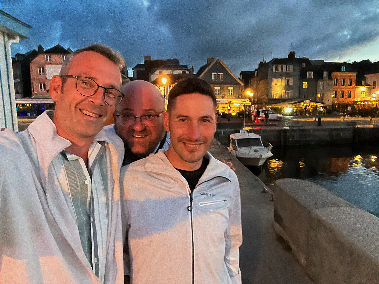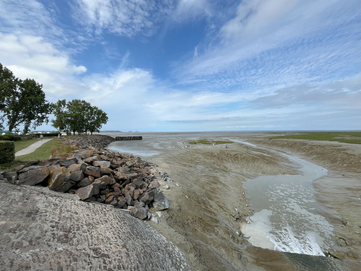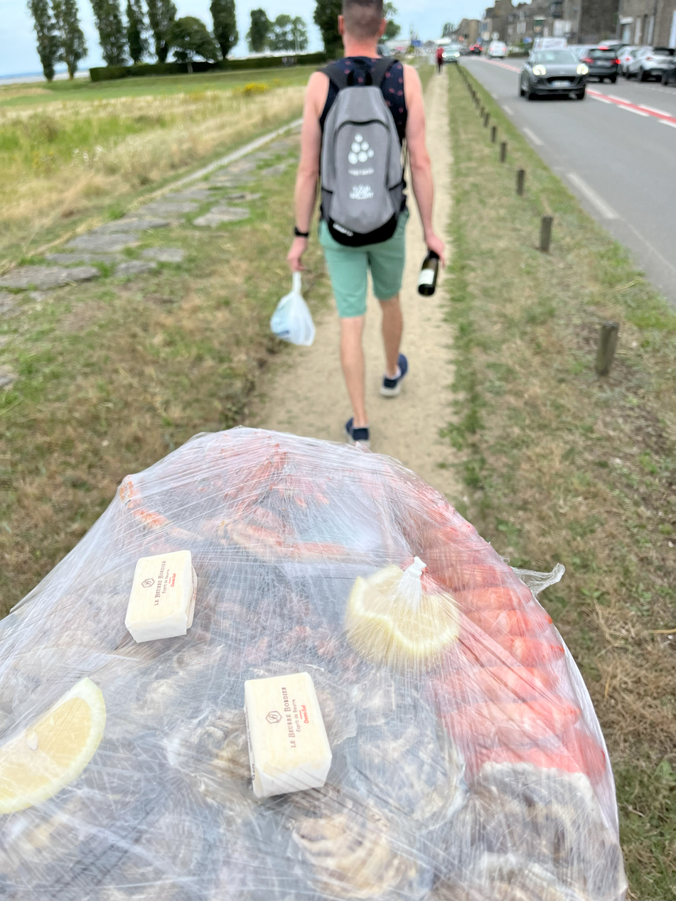 De zaak wordt precies door een schare nichten en een potige pot gerund. Nieuwsgierige blikken in onze richting verraden dat hun gaydar overuren draait. Aan Cris zullen ze het niet zien, waarschijnlijk loens ik te begeerlijke naar Wouter die van zijn oesters slurpt. Het is gestopt met regenen, we betalen met de zangerige complimenten van de zwierige patron: “Merci messieurs, je vous souhaites encore une très jolie journée.” Langs de oesterkramen bij de pier en over een klauterpad bereikt onze gespierde atleet als eerste en daarna ook ik een point-de-vue. Uitkijkend vanaf die rotspunt over de oesterbanken, met daarachter in de verte zicht op de Mont Saint-Michel, wachten we op Cris. We laten het stipje aan de einder voor wat het is en wandelen op zijn tempo verder tot in de bovenstad.