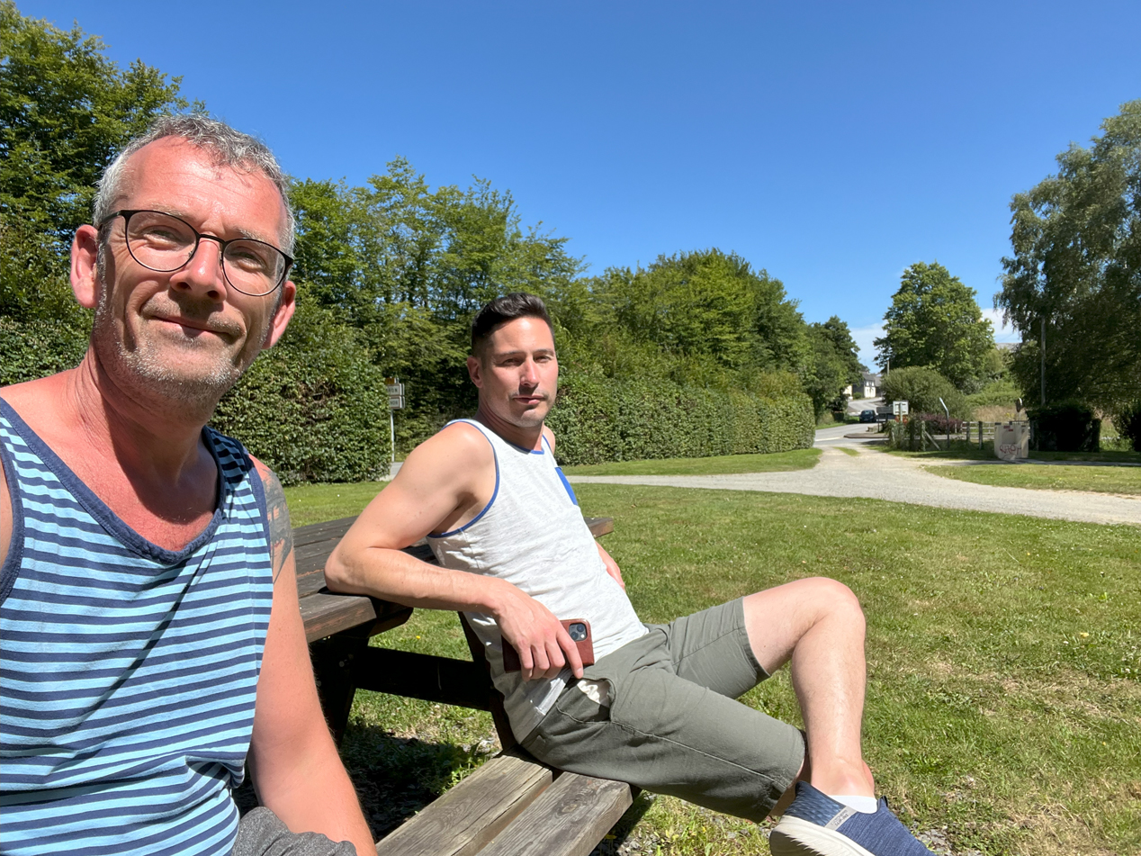 Rond de middag hebben de het snelle asfalt verlaten en tuffen via de D1 naar de N24 die ons terug richting D767 en uiteindelijk ook ter bestemming brengt. We zijn ondertussen al bijna een uur in retard en ik moet dringend de benen strekken. Mijn twee venten hebben dorst en al een klein hongertje. “Buikje al een beetje boos?”, vraag ik aan Wouter die naast mij zit. “Nee, nog niet echt”, reageert hij verlegen, maar een stuk Kouign Amann gaat er wel in. Net voorbij het centrum van Mohon, een van god vergeten gat, stoten we onverwacht op de gemeentelijke camperplaats. Heerlijk zomerweer op een oase van groen en rust waar ik gerust zou durven blijven staan! Maar we moeten voort met een dikke 100 km naar Camping Municipal du Goviro op de punt van Presqu’Île de Quiberon.