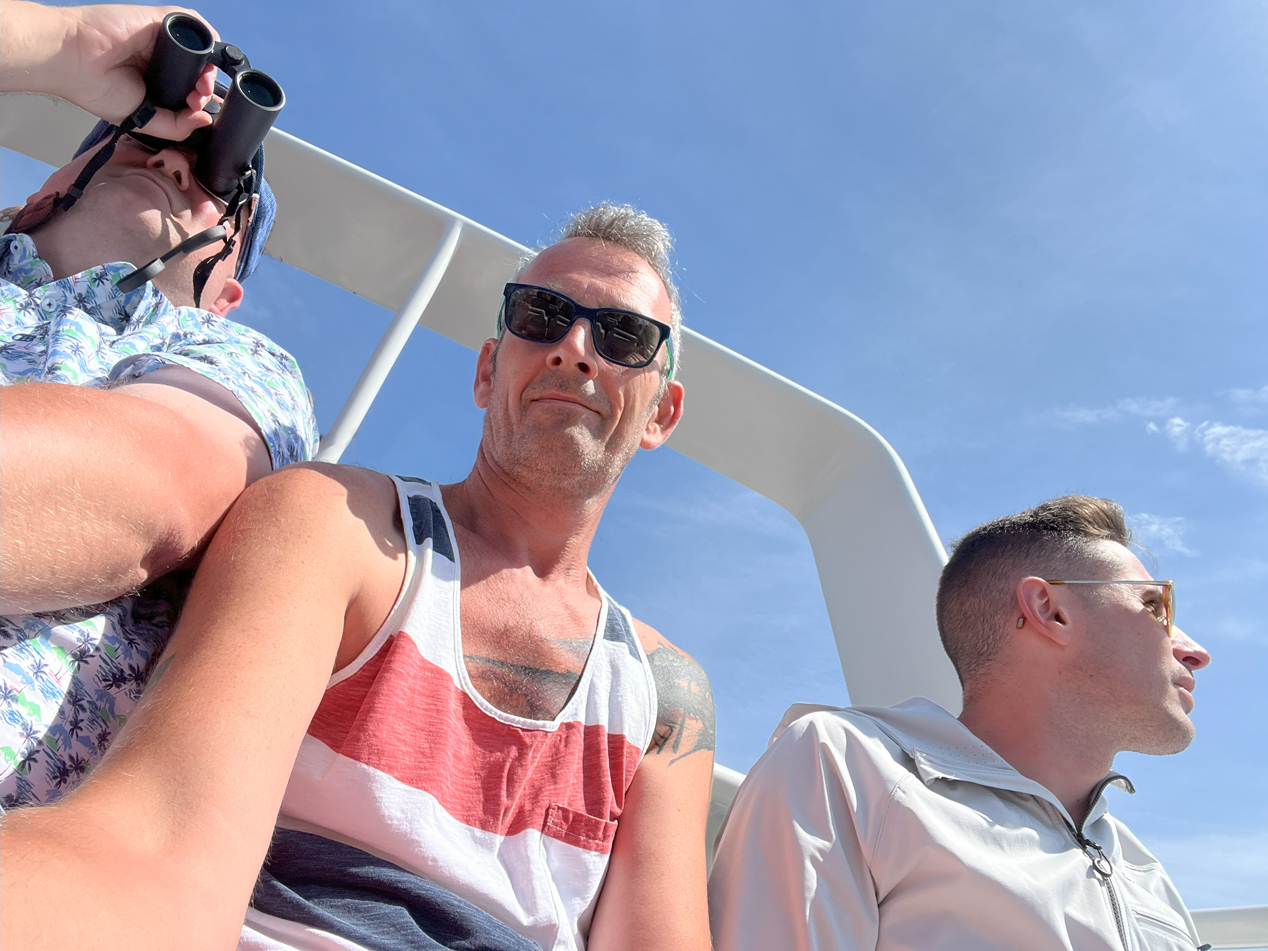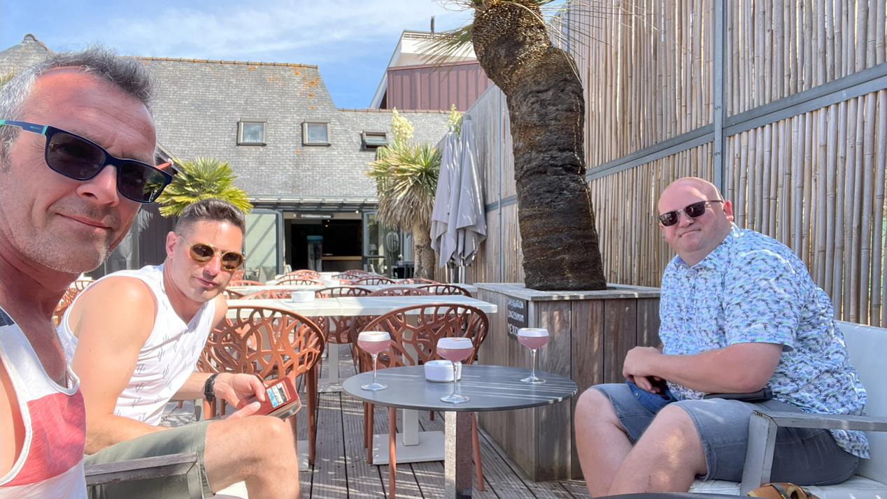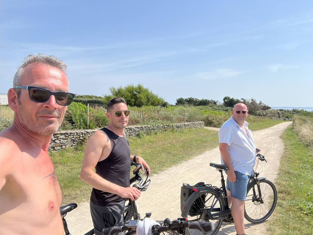 Langs dezelfde as kilometers verderop in zee ligt Île de Houat, rechts ervan het veel grotere Belle-Île-en-Mer dat haar naam leent aan de sardines of de rillettes de thon van La Belle-iloise. Die conserverie is eigenlijk als La Quiberonnaise begonnen, achter de hoek van Port Maria op het einde van de fietslus. Na een selfie houden stijlpoes, brombeer en mopperkont het voor bekeken. We fietsen verder naar Port-Haliguen om aan de jachthaven verfrissing te zoeken bij Café du Midi. Stilstaand op het plein bij de jachthaven om de fietsen te stallen, breekt het zweet mij over het ganse lijf uit. De zwarte inktvegen in mijn vel branden er bijna letterlijk uit in de felle zon. “Wie kan er wat zonnecrème smeren op mijn rug?”