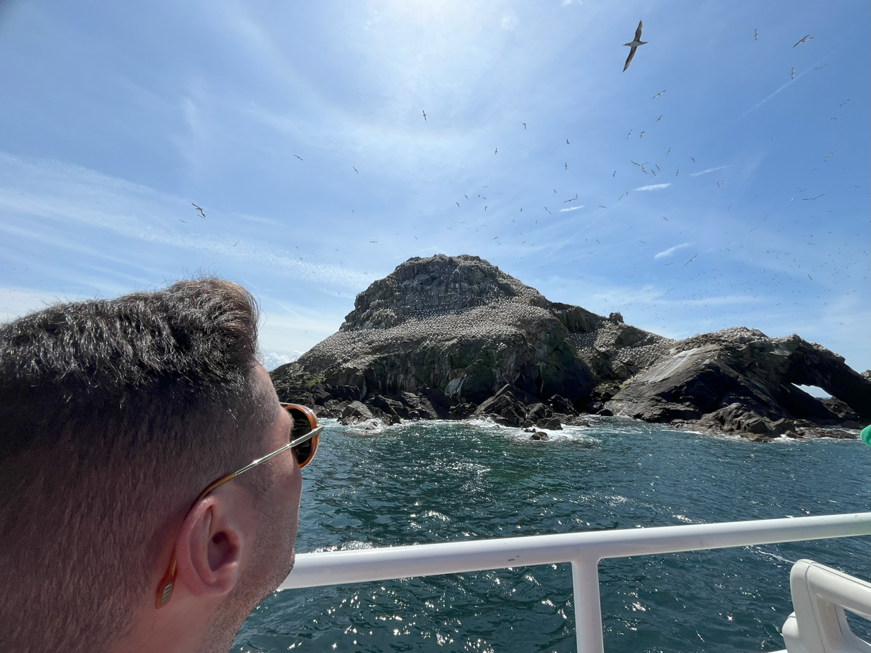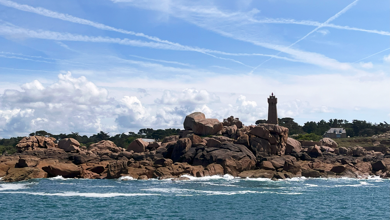 Onder luid applaus van de wachtende menigte voor de volgende rondvaart begeeft de laatkomer zich met het schaamrood op de wangen naar de dansende treeplank tussen wal en schip. Die deint vervaarlijk op de baren van binnenlopende onze boot, want onze kapitein vindt blijkbaar dat het welletjes is geweest met de vertraging op het afvaartplan. Wanneer we de baai uitvaren neemt die het woord: “Mesdames et messieurs, soyez les bienvennues. Dans un instant vous découvrez le spectacle incroyable de la colonie de fous de bassan aux 7 îles, réserve naturelle ornithologique la plus grande de France. Longez la Côte de Granit Rose et laissez place à votre imagination grâce aux rochers roses !”