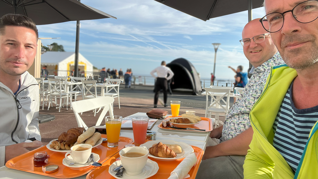 Het ontbijt we nemen bij Le Ty’Time, het salon-de-thé van het Grand-Hotel, zo verdienen de snoodaards toch nog iets aan ons. De strandboulevard wordt ingenomen voor één of andere strandloop met luide muziek en omroepers die door de speakers brallen vlak voor het terras van het koffiehuis. Service au comptoir, plakt er op de tafels, die casino-medewerkers zijn echt te lui om te werken. Na de josé en zonder ochtendkoffie speelt mijn tremor op, iets wat ik van mij opa heb geërfd. Een dienblad dragen met een kop koffie en een glas fruitsap erop lukt mij sowieso al niet dus draagt Cris eerst het zijne naar buiten, dan vertrekt Wouter en komt mijn echtgenoot het mijne halen nadat hij afgerekend heeft. Samenwerkende vennootschap P. Arkinson.