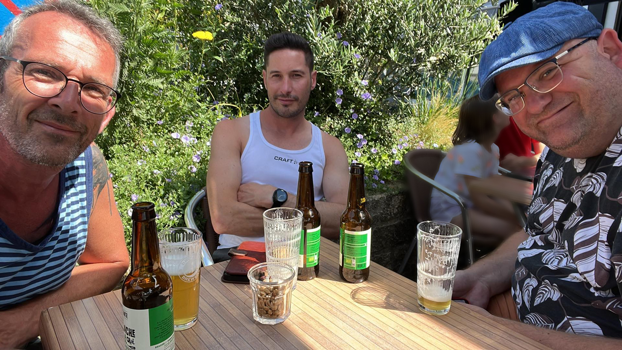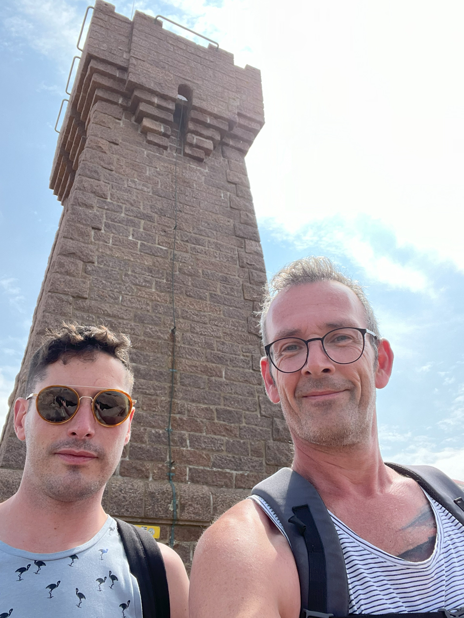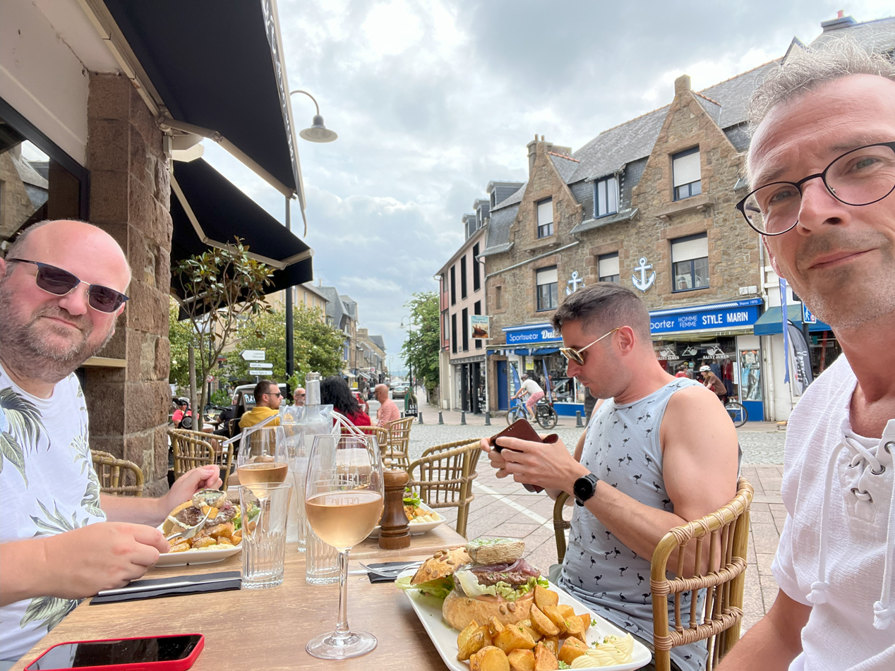 Google zei dat het 4 km was en een uur wandelen, maar na drie kwartier staan we al bij de Phare de Ploumanac’h. “Goed doorgestapt”, antwoordt Cris wanneer we hem een selfie sturen. Ik herinner mij horecaterrassen op een plein waar de sentier stopt bij Plage de Saint-Guirec. “Een tafeltje voor twee, alstublieft?” Een fles cider op het terras van Le Coste Mor en dan met een variatie op de route over het douanierspad terug. Na een dik uur staan we terug bij de glad geschoren grizzlybeer die met een fles Billy op zijn dorstige wandelaars wacht.