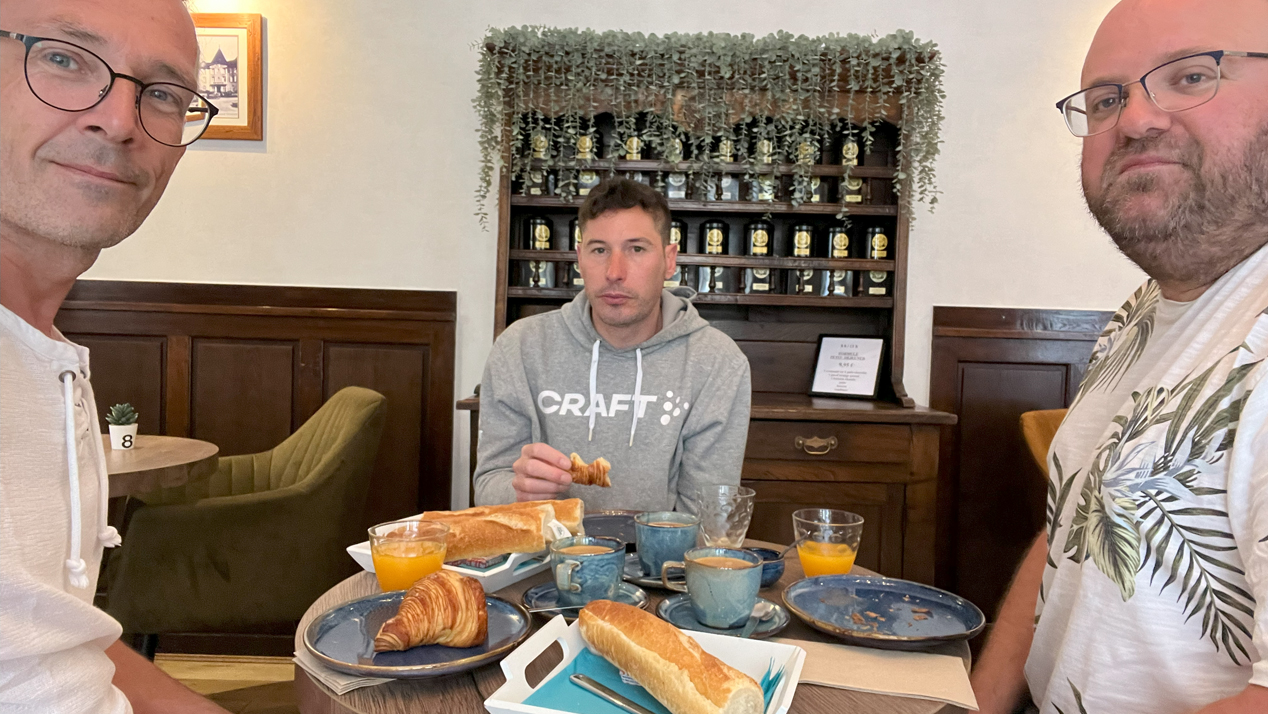 Wouter slaapt nog wanneer ik rond zeven uur door een bericht van zijn buurvrouw word gewekt. “Dit beeld wil ik u niet onthouden,” stuurt ze, samen met een filmpje van de straat die bijna tot aan de voordeur van onze kameraad onder water staat. De onweerswolken die gisteren boven Frankrijk gevormd werden, zijn daar uitgevallen. Het riviertje voor hun deur, de Voer, dat normaal gezien maar een deftige beek is, is over zijn volledige lengte overstroomd. Stortbuien hebben modder van hoger gelegen velden mee naar beneden gebracht, en die smurrie staat bij andere huizen tot op het gelijkvloers en in de kelders. “Oh nee, ik ga hem wakker maken!” Waarom stuurt Chloé trouwens naar mij en niet naar hem? “We staan nog in Rennes, moeten we naar huis komen?” Niet dus, want het is daar gelukkig al opgehouden met regenen en het water trekt langzaam weg.