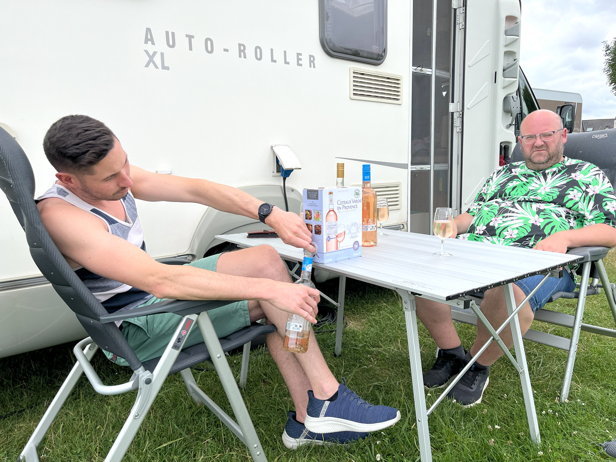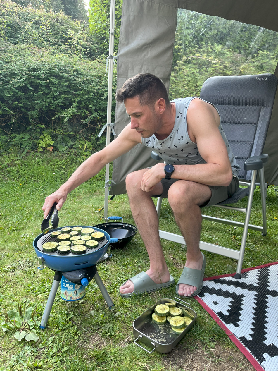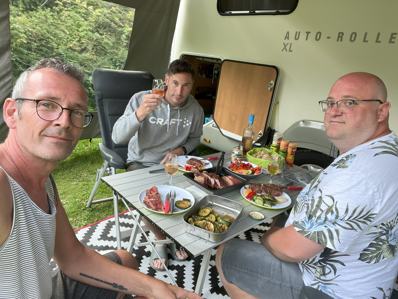 De grauwe lucht breekt open samen met het zegel van onze eerste Billy-fles en de zon brandt zelfs bij het openen van de eerste fles ‘josé’. De luifel biedt soelaas. Het is drukkend warm en de donderbeestjes vallen al uit de lucht. Niet alleen schaduw onder de luifel, ook beschutting wanneer de hemelsluizen open gaan. Het startschot om de grill aan te steken, eer er gedonder volgt. Wouter bakt zijn gigantische zesrib tot perfectie en versnijdt het malse vlees vakkundig voor zijn hongerige vriendjes. De poezen van de ciderboerderij schooien zelfs zo hard dat onze dierenvriend het afgekloven been aan de rosse kater geeft. De onverschrokken leeuw ligt een paar tellen later als een dikke Garfield naast de Autoroller languit op het houten terras.