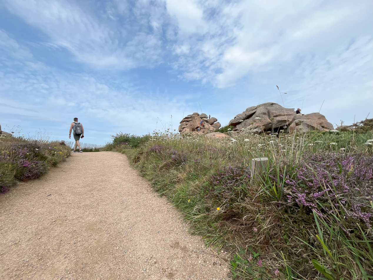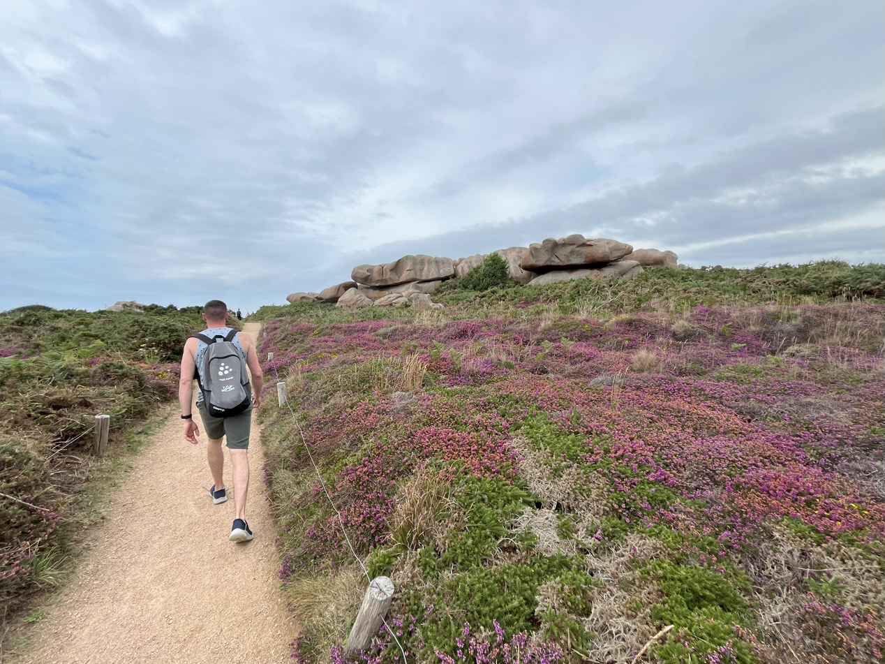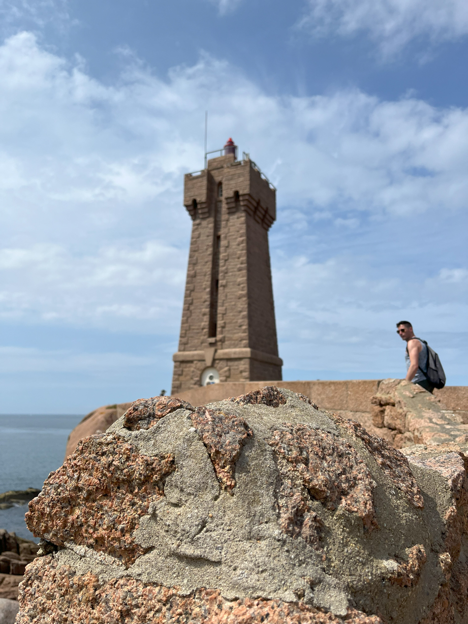 Het is ondertussen zomers warm en al ver drie uur wanneer we terug op de camping aankomen. Genoeg inspanning voor vandaag, denkt Cris. Hij neemt een namiddag rust terwijl ik met Wouter langs de Sentier des Douaniers naar de vuurtoren stap. Dat was toen met Marc op de fiets ook al een helse klim en daarin heeft mijn echtgenoot niet meteen zin. Eer hij zijn baard gaat afdoen wuift hij ons uit. Blij als een kind dat mee naar het pretpark mag, huppel ik achter onze sportman aan naar het roze graniet. De wandeltrack begint achter de Base Nautique en ik moet al mijn best doen om hem te kunnen volgen. De hoogstaande zon heeft redelijk wat volk op de been gebracht. Doorstappen op zijn tempo lukt niet altijd, maar hij laveert vinnig als zijn Italiaanse windhond tussen de trage wandelaars door. “Lief, wacht es!”