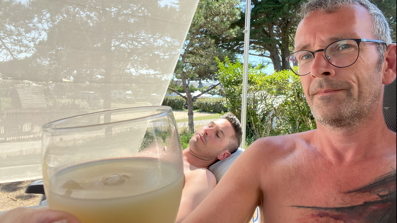 De nachtelijke hemel staat al vol sterren en straatartiesten zorgen voor amusement op de boulevard. Morgen wordt het bijna 40 graden in het binnenland, dat is zelfs voor mij van het goede te veel. Als het echt zo warm is, blijven we gewoon gans de namiddag in de airco zitten van het Alma shoppingcenter. Het oude Rennes bezoeken we wel eens een andere keer, hopelijk wil onze kameraad ooit nog eens mee op vakantie. Zelfs met een lichte beneveling maak ik mij zorgen dat dit de laatste zomer samen is. We gaan met een amicale zoen naar bed en het duurt niet lang vooraleer het zachte ademen van onze knuffelbeer mij ook in slaap wiegt. Weliswaar nadat ik onze voorlaatste etappe nog heb geboekt: Camping du Lac in Pont l’Évêque. Of dat denk ik toch terwijl Cris met Netflix op zijn iPad naast mij ook al begint te ronken…