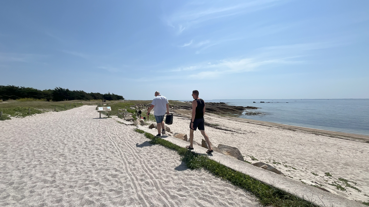 Na een lunch met rauwe ham en Charentais wagen we ons aan La Boucle de Quiberon, een circuit cyclo van 15 km met als eerste stop de Pointe de Conguel of de bijna een kilometer lange landtong van Beg Kongell. Het is kort over de middag tropisch warm. De zon brandt te fel op het witte korrelige zand om blootsvoets helemaal tot aan de dolmen op de pointe te stappen. Ooit was Kongell een eiland op een richel voor de kust waar in de loop der eeuwen zand is tegen afgezet. Hetzelfde kan dus eigenlijk ook nog gebeuren met Îlot de Toul-Bihan en Îlot de Toul-Bras twee eilandjes in het verlengde van Conguel richting de rots met Phare de la Teignouse.