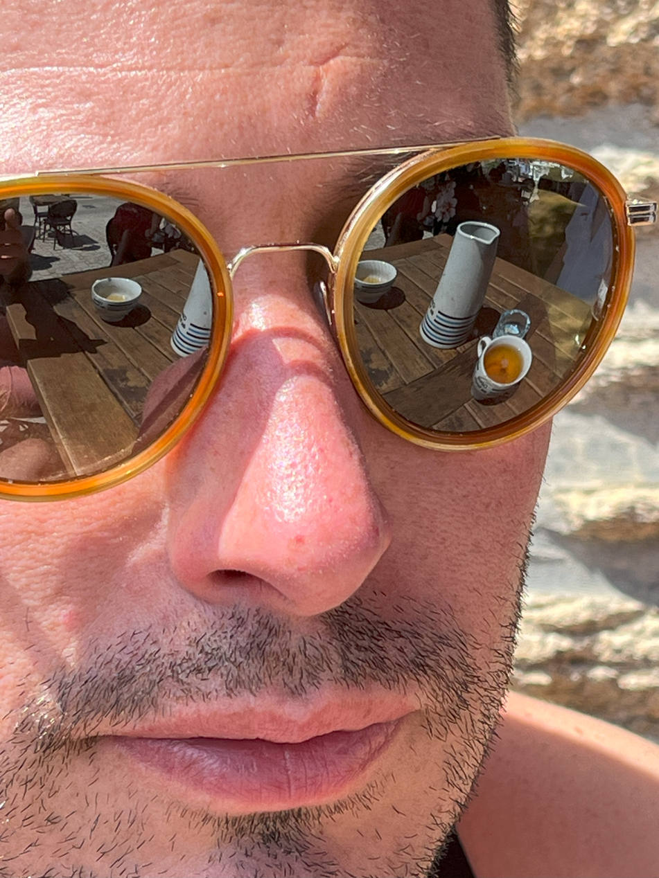 Onderweg naar onze rijwielen valt Cris zijn oog op een tweede Hublot-boetiek, een popup waar ooit een Blanc du Nil franchise was. “Misschien heeft die mijnheer uw donkere bermuda wel? Allez ga binnen”, gebaart Cris naar zijn shopgrage kompaan. Een kwartier later staan we terug op de stoep met zijn ontbrekende short en twee nieuwe longsleeves die hij voor mij mocht kopen omdat het hier ’s avonds te koud wordt. “Maar zo is de rekening nog niet effen”, moppert hij. “Schattebol het eerste tourneetje is van u”, zo is iedereen content op het terras van Le Gailon. Het licht wordt scherper wanneer we weer op onze elektrische fietsen kruipen. Wouter doet het zo goed als zonder, ik op de fel stijgende Route Panoramique met mijn kleine wieltjes niet. Cris komt zelfs helemaal buiten adem boven toe.
