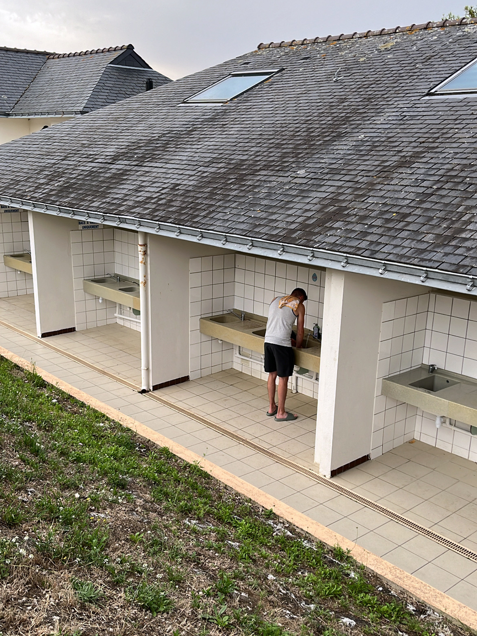 In andere omstandigheden zou ik het stuur met plezier aan mijn co-piloot geven, maar ik voel dat de Transit aan zijn limieten zit. Zo goed als volgens planning arriveren we bij de camping en Cris meldt ons bij de receptie aan. Iedereen heeft zo zijn eigen taak, hij krijgt een plaats op het middenplein. Zo gauw we geïnstalleerd zijn, toon ik onze tochtgenoot waar hij straks kan douchen en ’tiktokken’. Het is zijn codewoord voor een grote boodschap en dat wordt dringend. Alles oogt een beetje gedateerd, maar grotere luxe hebben we niet nodig. Er staat vandaag niets meer op het programma anders dan eens langs de kustweg te wandelen tot aan de viviers van La Perle des Grèves.
