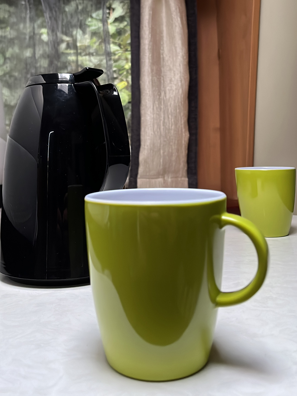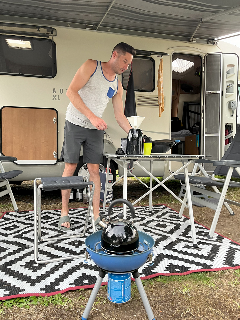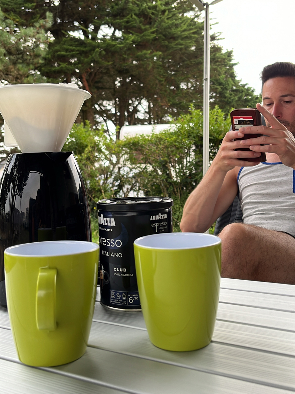 De koffie was er blijkbaar nog en de twee pakken Gwenn Ha Du mogen in de koffer onder het bed. Wouter heeft maar een half woord nodig en zet ineens de moor op het fornuis. Het trage branden van de Arabica bonen bij L’Hermine Gourmande zorgt voor een uitgesproken mild karakter, de koffie en niet het mijne. Morgen zetten we een pot goed humeur van François Le Hénaff om de dag te beginnen. Vandaag gieten we de rest van een blik Lavaza nog op. Zalig zomerweer en na het late ontbijt gooien we de rugleuning van onze kampeerstoelen achteruit. Lekker lui wegsoezen en na de koude ochtend opwarmen in de weldadige zon. Eindelijk zomervakantie in Bretagne, zoals we het ons hadden voorgesteld!