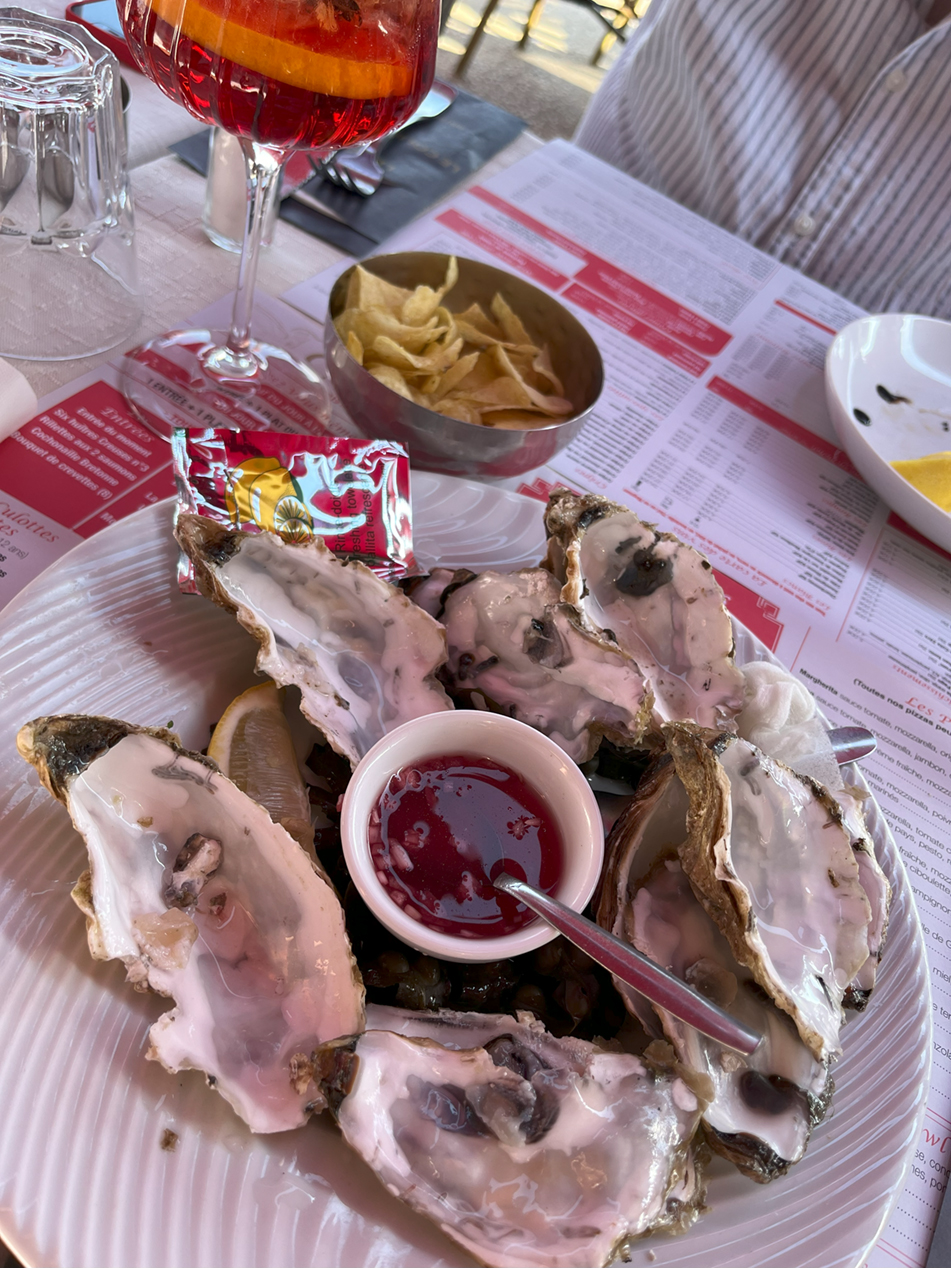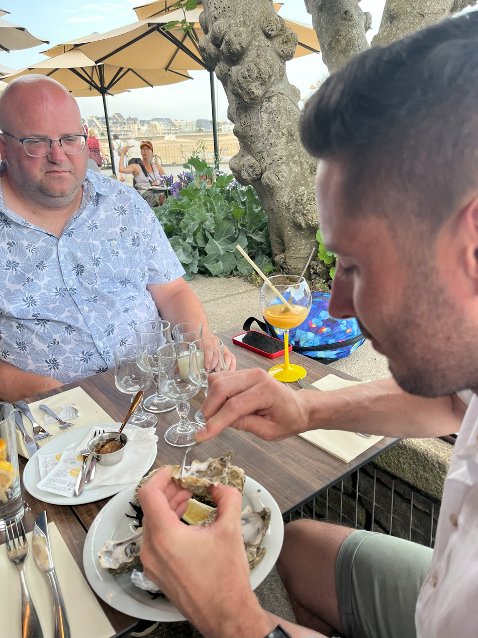 De rest van de rondvaart gaat langs de kustlijn waar Wouter en ik gisteren wandelden. Hier verklapt de gids welke namen middeleeuwse vissers en koopvaarders de grillige rotsformaties gaven, van schildpad tot zatlap en duivelskasteel. Aan het einde van de boottocht zijn we uitgedorst en het is ruim half vijf dus al ver apérotijd dus stappen we voor het avondeten nog even binnen bij La Suite, of liever naar hun lege terras. De ardoise van het restaurant annex lounge en cocktailbar lokt mij met de boodschap dat ze oesters serveren. De keuken is helaas uitzonderlijk gesloten, weet de ober. “Dat is toch gewoon een schelp open doen”, bedenkt Wouter zich. Tja, eigenlijk kan een barman dat ook…