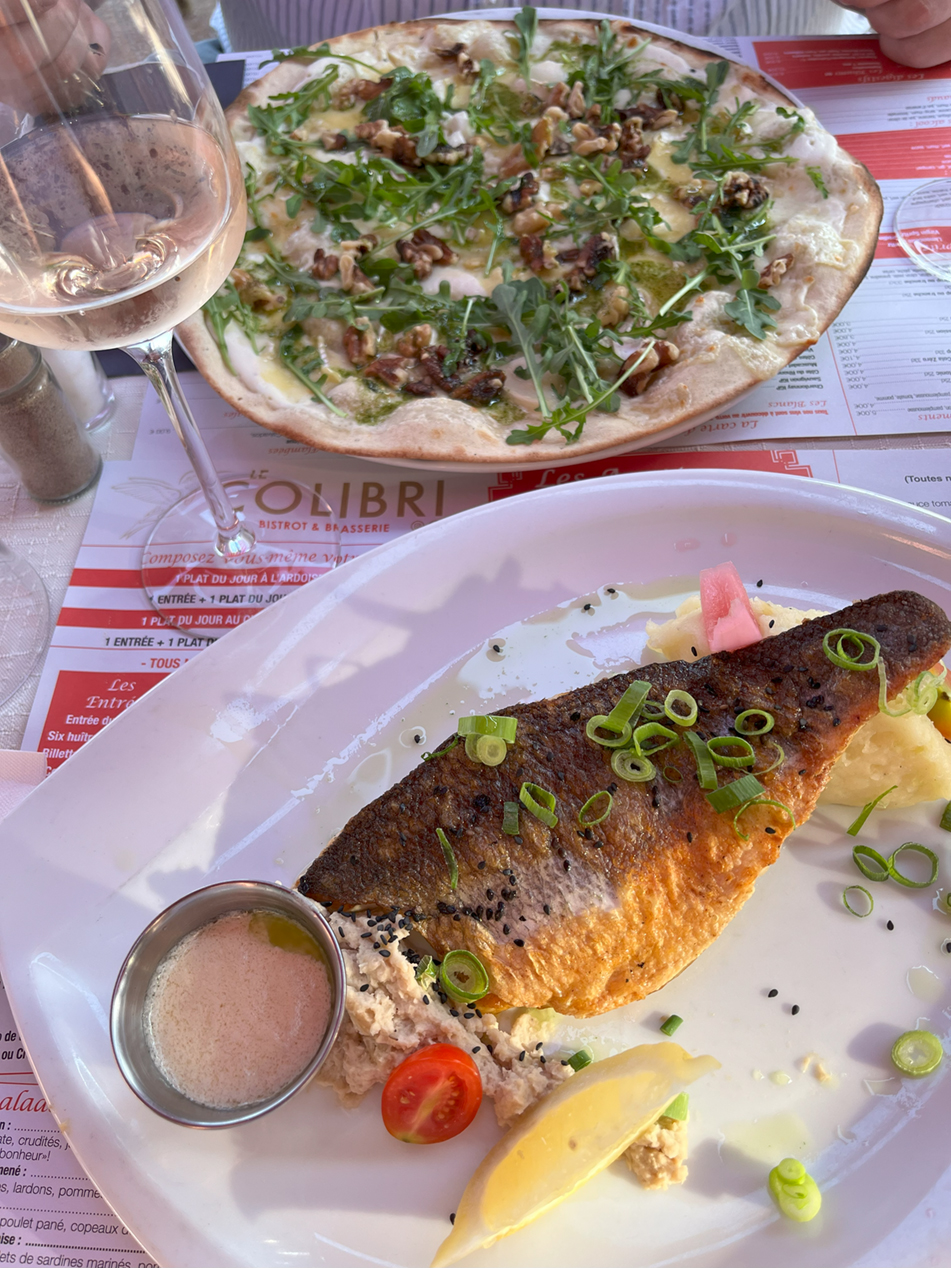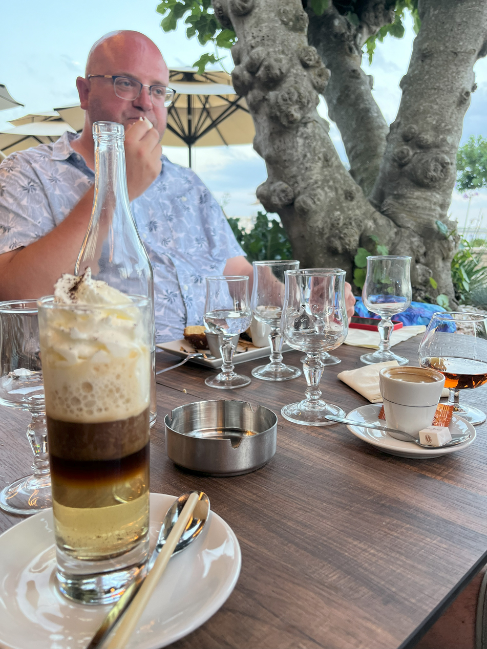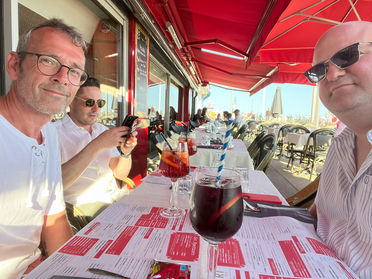 Het eerste waar we voorbijkomen met een tafel in de schaduw op een terras is Café – Brasserie Le Colibri. Waarschijnlijk een toeristenval, maar dat deert ons vandaag niet. Ze serveren er Américano, oesters, tartare de thon en bij de plat een fles josé. Niks verfijnds, gewoon een pizza en een op vel gebakken zeebaars voor de overjaarse pubers. “Un petit dessert?” “Bien sûr,” zegt Cris, hij kan na die lichte hap nog een coupe caramel au beurre salé op. Wouter en zijn oude zot houden op een “Irish”, seulement liquide. “Sebiet nog koffie met een poes,” vraagt onze anderhalve trouwboek. Dat is dubbel koffie, denkt Wouter en vraagt zich af of een Américano als digestief wel toelaatbaar is. “Lieverd, het is vakantie hier mag àlles!” Zelfs nog eentje als afzakker in de bar van het Kasino, ook al huppelt onze derde helft dan iets te vrolijk terug naar huis.