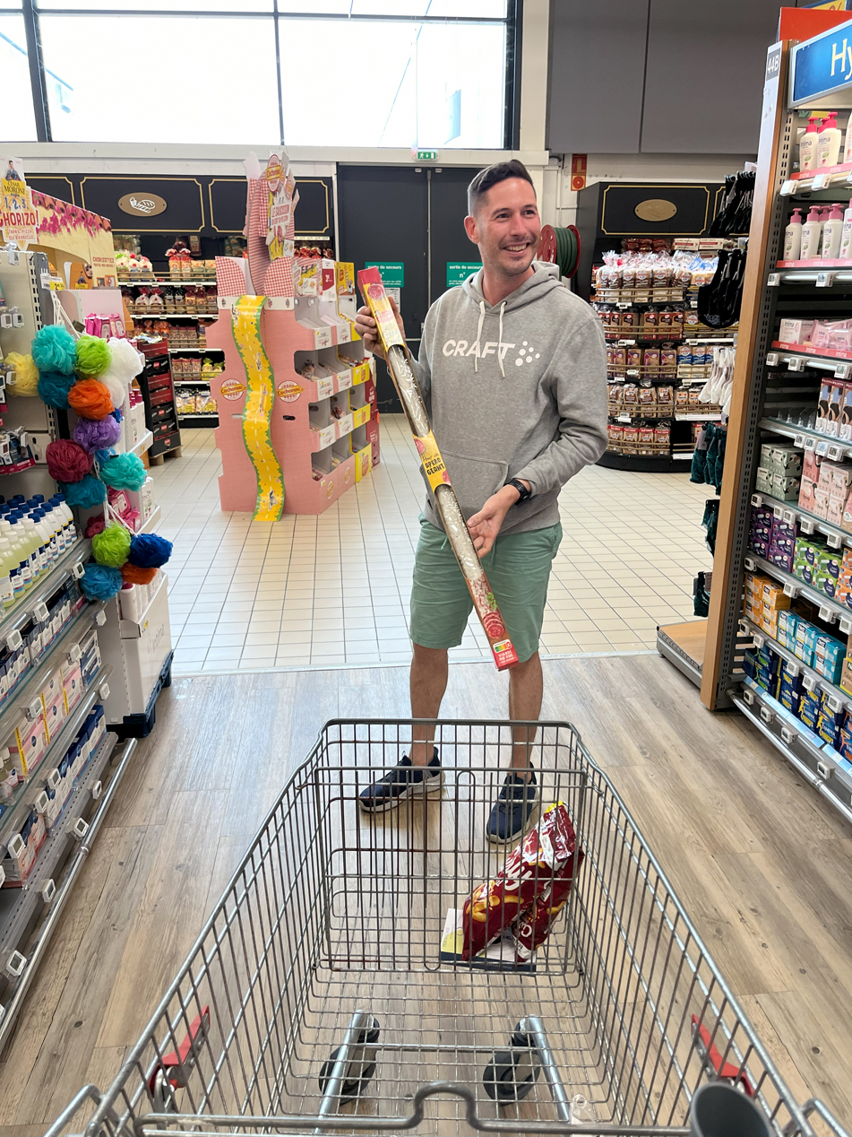 Eerste stop het grote Cora-magazijn: onze kapoen heeft een fascinatie voor grote worsten en dat viel mij vorig jaar in de Super U al op. We zijn nog niet goed binnen of hij heeft al een Grand Fuet in zijn handen en pretlichtjes in zijn ogen. Wouter! “Pour un apéro géant”, probeert hij nog. “Allez, het is goed pakt uwe saucisse maar mee als ge graag eens ne grote hebt.” “Stijn, die geraakt zelfs niet in uw kast en per kilo kost die meer dan twee kleintjes”, merkt hij prijsbewust op. “Neem dan die kleine he, dat formaat zijt ge gewoon”, plaag ik hem. Lachend om mijn puberale praat zoeken we de boodschappen waarvoor we eigenlijk zijn gekomen. Kippenhaasjes, chipolata’s en merguez voor op de grill, verse groenten ook en nog wat meer lekkere hapjes dan alleen zijn droge worst.