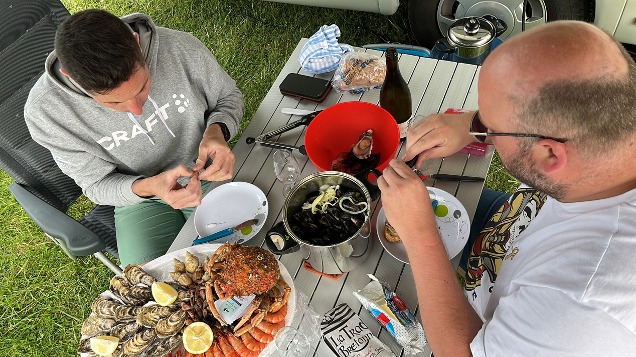 “Gij moet dat toch niet betalen”, protesteer ik geveinsd. Maar de triomf in ons dagelijkse gevecht om de rekening is hem gegund. We stappen terug, ik met de fruits de mer balancerende op één hand om een foto te maken, hij met grote passen voorop met in één hand het zakje moules de bouchot en in de andere zijn fles. Een paar minuten op het campingaz vuurtje en de eerste mosselpot wordt al opgeschud. Een uurtje later is scheepslading zeevruchten door Cris zijn smulpapen verorberd. De tweede pot mosselen met wijn gaan er ook nog achteraan. De buikjes zijn blij maar misschien is er nog plaats voor een dessert. “Zin in een ijsje?” Waarom niet! Gedrieën wandelen we nog één keer naar de foodtrucks op de avondmarkt tot groot jolijt van een meisje met haar nog net niet sluitend roomijskraam.