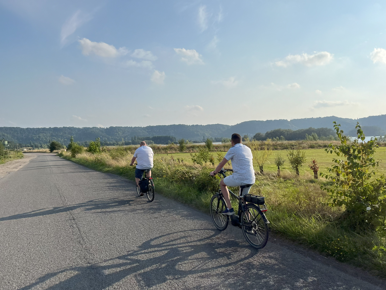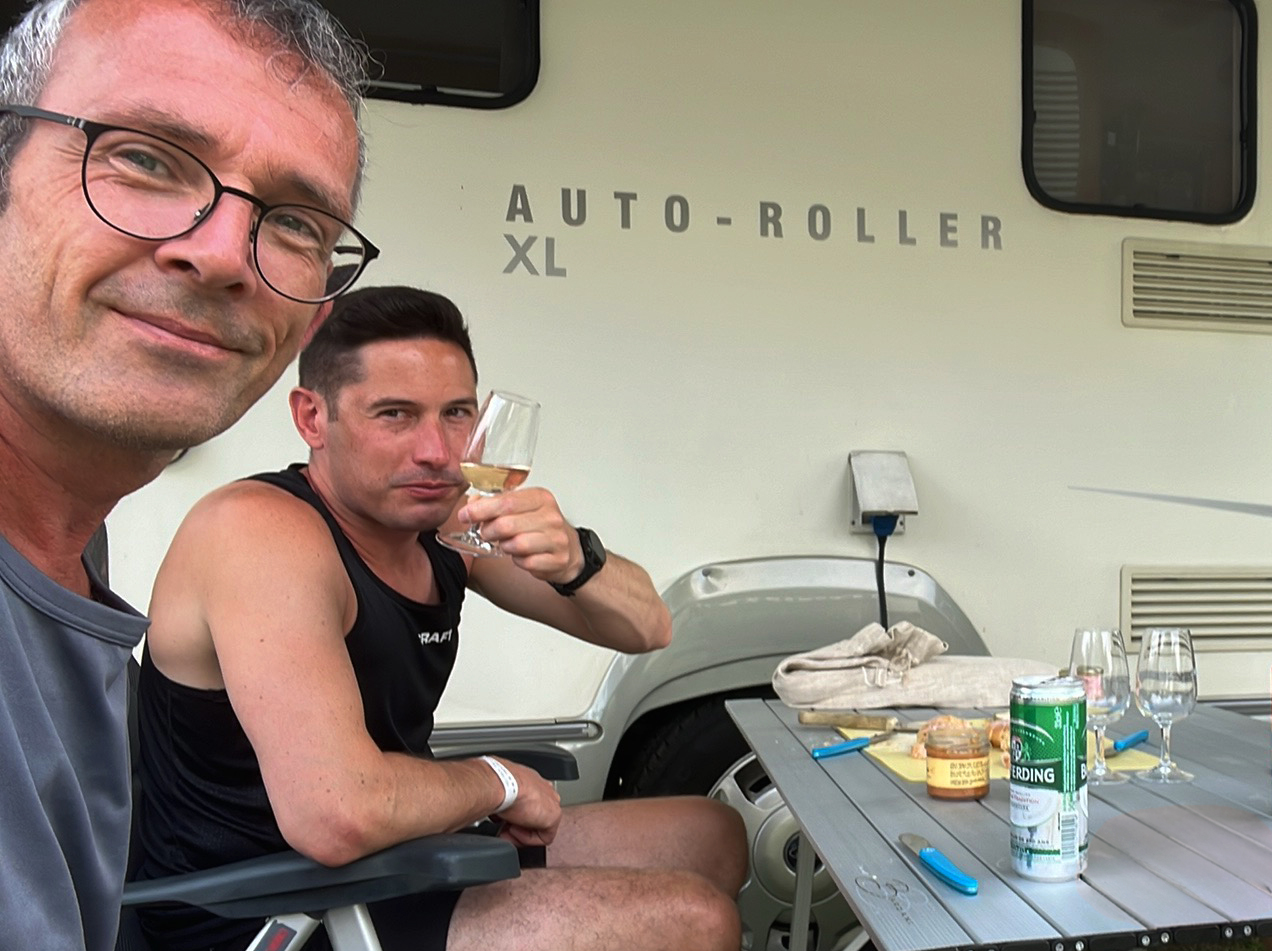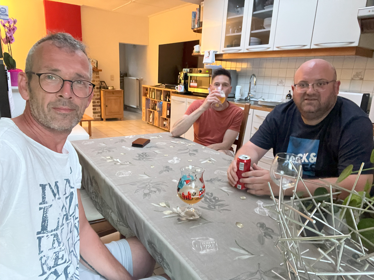 Cris neemt de proef op de som en haalt de weegschaal. Het scheelt amper 3 kg, ik had op meer gehoopt want we flirten met de maximale tonnage. Drie volwassen mannen, hun bagage, de e-bikes op de drager, een tweede koelkast in de koffer en het extra bed souperen alle laadvermogen op. Poetsen en inladen is voor morgenochtend: “Ga al maar naar huis, ik ga mijn rap wassen, binnen een half uur zijn we bij u.” “Billy meenemen is toch echt geen optie,” zeg ik ’s avonds met een Duvel in de hand tegen onze reisgenoot. Hij bevestigt met een grapje: “Nee want gij waart daarstraks al een gezooien tomaat.” “Ahwel ja, merci Wouter. Ik zàg u graag!” Met de nadruk op zag, lachend, want we weten alle drie dat ik onze vriend-aan-huis voor eeuwig en één dag graag zal blijven zien.