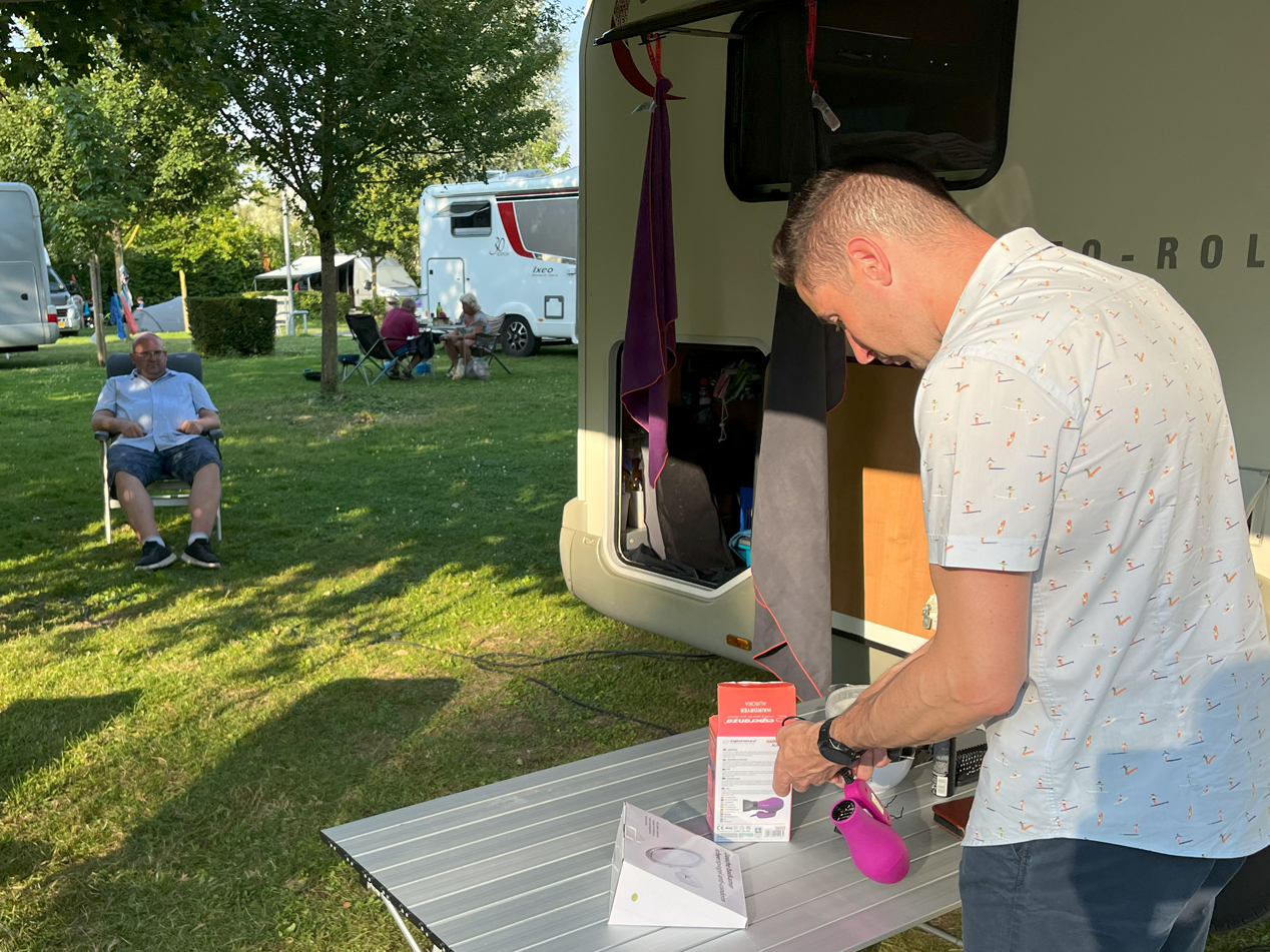 Het lijkt wel een sauna in de Autoroller die al de hele middag in de volle zon staat. De mannen zijn al terug en Wouter komt even kijken terwijl ik onhandig met mijn hoofd in de kleerkast zit. Foeterend op een stel in de kabel prikkende klemmen die maar geen verbinding willen maken, vraagt hij voorzichtig: “Lukt het, Stijntje?” “Nee, die klotenest werkt niet,” mompel ik, rood aanlopend van de hitte en ergernis. Hij sluipt op zijn kousenvoeten naar binnen en wacht geduldig bij de puffende grizzlybeer, want ze wilden eigenlijk gewoon weten of we vanavond samen frietjes eten. Een klassieke lusterklem lost mijn onhandigheid met die meegeleverde koppelingen op. Waarom ben ik dat verdomme ook koppig blijven proberen? Het is eindelijk gelukt. “Kom eens kijken!”