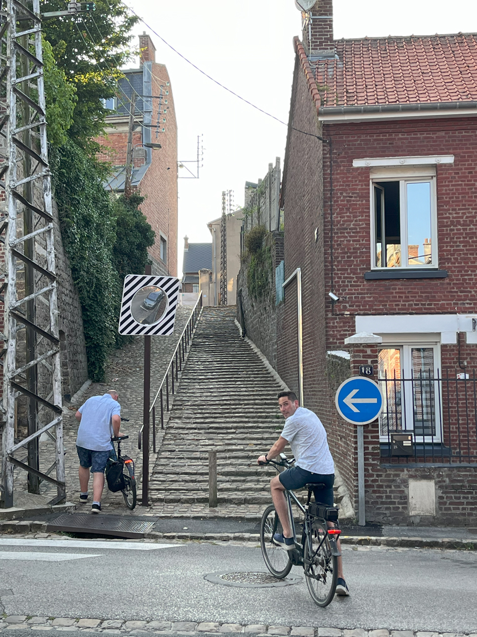 Wouter kijkt nog even om naar zijn achterblijvende kompaan. Dan spurt hij als een echte Flandrien, rechtstaand op de pedalen, naast de trappen van het steile steegje over de kasseien naar boven. Ik hobbel met genoeg doping en in veldvitesse achter hem aan op mijn kleine gele fiets. De gps had gelijk, het was de kortste weg terug naar de oude burcht, maar niet de makkelijkste. De eindmeet halen we net voor ook Cris buiten adem boven staat: “Om terug te gaan, pakken we die weg niet meer he!” We parkeren de fietsen voor de deur van de Bistro en stappen naar binnen voor, hoe kan het ook anders twee Américano’s en een Gin Tonic.